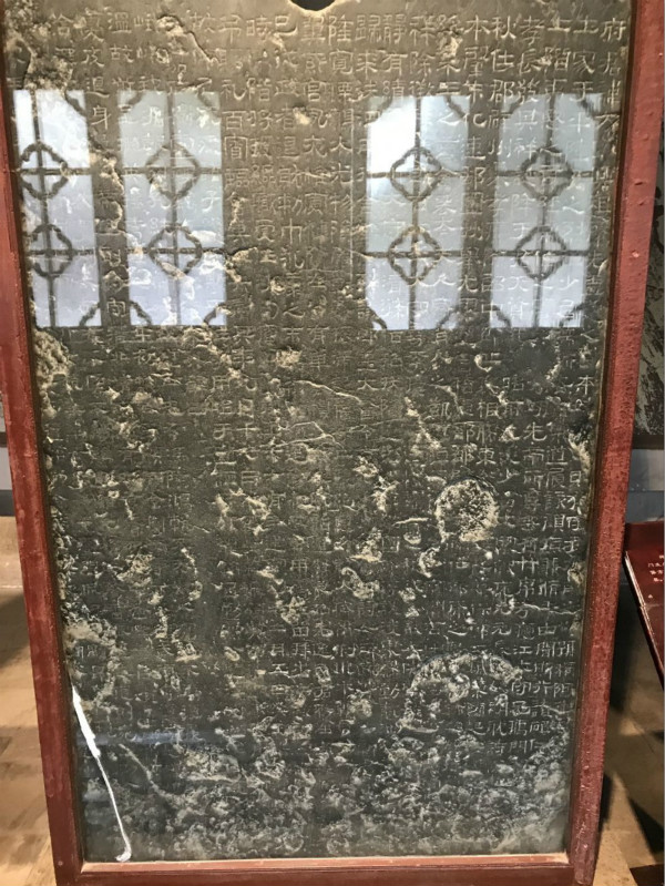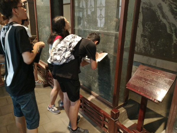 张迁碑与衡方碑被放置在岱庙东廊碑刻陈列室,作为汉隶经典碑刻,周身被玻璃罩所保护。到达目的地后,各小组成员立即有序的展开考察与研究。在考察过程中,分管书法和异体字研究的赵浩森和郑婷予两位组长还不时地查阅资料和进行交流,对碑文中的同字异形和古体异体字进行逐个观察与记录,确保了整个考察工作的顺利进行。