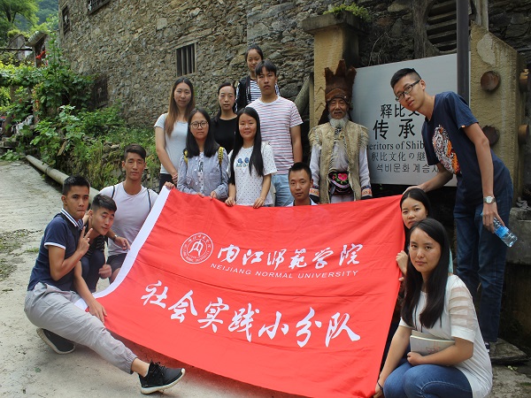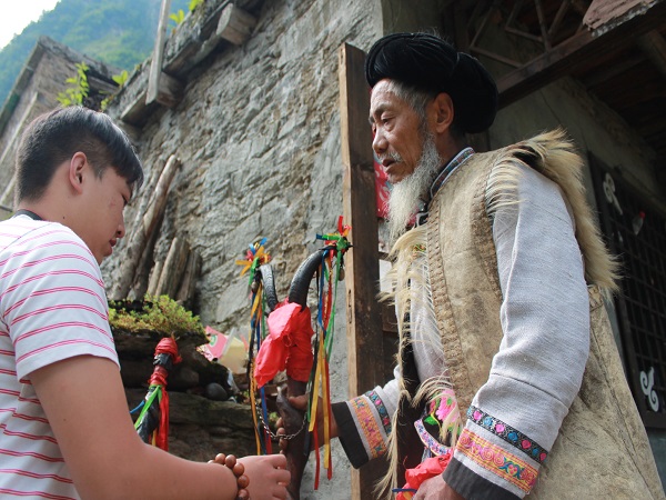 13日上午,实践团队找到了释比文化的传承人,向其了解了一些有关羌族祭祀的流程和羊皮鼓的制作演绎过程。据了解,羌族的祭祀大致分为三个过程:上坛,祭天祭地祭万物;中坛,祭人事保平安;下坛,驱邪治病。每一个部分都有不同的穿戴服饰,并且代表着不同的寓意。此外,祭祀时手拿的羊皮鼓也分为黑鼓和白鼓。白鼓,用于寄天神;黑鼓,则代表着驱邪治病。在不同的祭祀场合要用不同的祭祀工具。在实践过程中,团队成员还了解到:鼓边上挂着的白边也很有讲究,每年的羌历新年都会换。在交谈过程中,释比文化的传承人还向我们展示了祭祀时所带的帽子、所拿的拐杖以及腰带上所悬挂着的物品。在此次实践活动中,团队成员都有了很大的收获,有了很深的感悟。14日,全体成员去到了汶川博物馆。在博物馆里,成员们看到了“5·12”大地震前后的对比图,有了很大的震撼。馆中还有一些羌族的服饰、刺绣作品、汶川地区出土的文物以及建筑介绍等等,也使团队成员对羌族文化有了一个更全面、更深刻的认识。