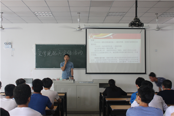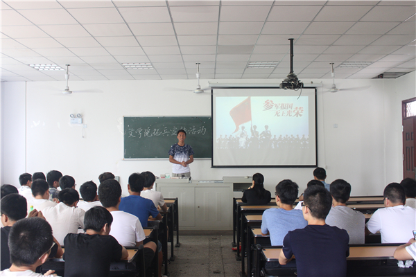 会议伊始,覃书记通过向同学们讲述入伍优惠政策以及播放2017征兵宣传短片来调动同学们报名应征入伍的积极性。随后,覃书记抛砖引玉,引出今天主讲人范贞强同学。他是一名2014年应征入伍的内师学子,今年退伍回到公司继续完成他的学业。范同学从自己为什么征兵入伍、自己在部队的成长经历、部队演习经历以及对未来的人生规划四个方面,为公司学子宣传征兵入伍思想。范同学首先讲到自己征兵的过程和原因,他说到:“因为那是我的梦想,我想要将梦想变成理想!我认为理想就是实现了的梦想!”由此,他也呼吁公司学子积极响应国家号召,应征入伍。接着,他讲述了自身在部队的成长经历。当他说到自己在部队两年的生活时,不觉红了眼眶。他对于这一段经历的评价是:刻骨铭心。公司学子认真聆听了范同学的非凡经历,并不时发出热烈的掌声。