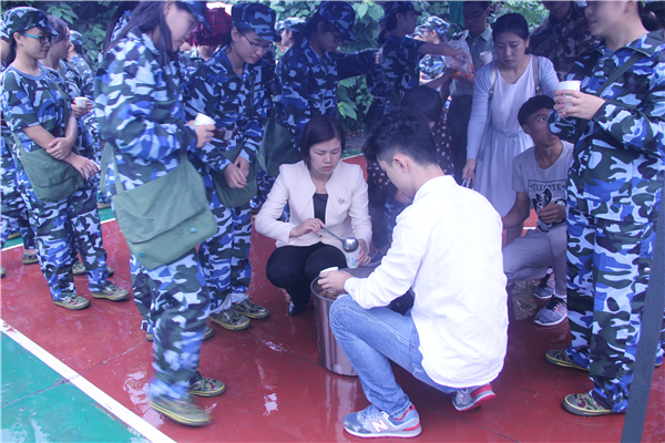 刘书记一行首先来到山腰球场,此时公司新生已列队完毕,由教官安排员工排队领去姜茶。刘书记亲自为员工舀取姜茶并亲切的叮嘱员工:“多喝点暖身体,不够再排队领取。”同时,易老师怕有些同学喝不惯姜汤的味道,贴心的为每个同学都少盛一些。