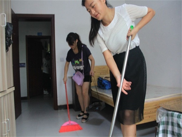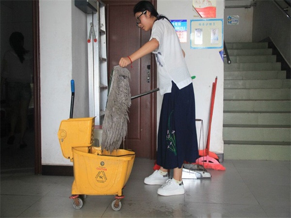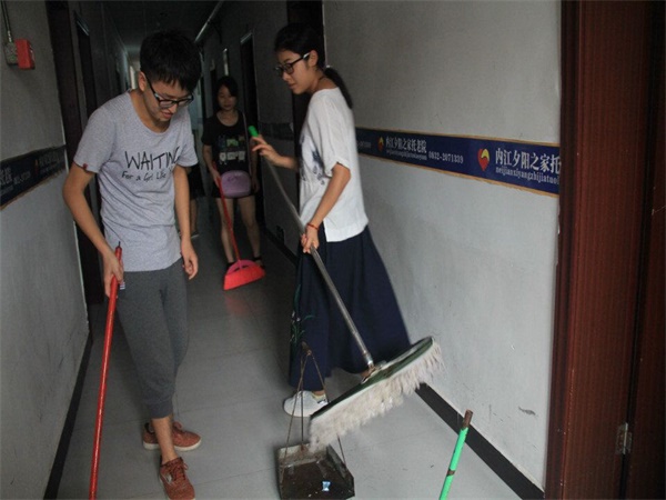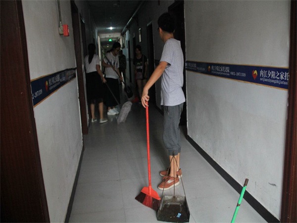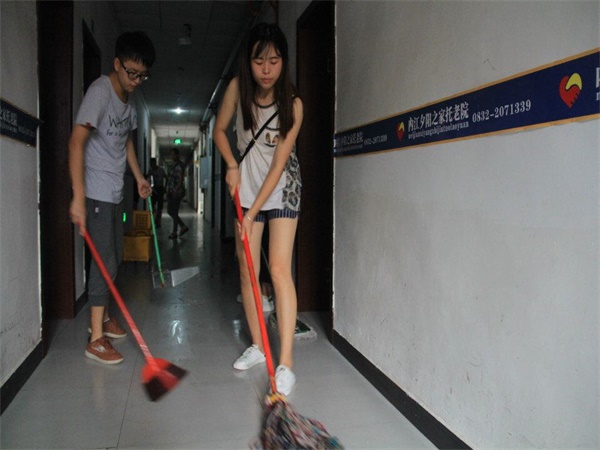 因为托老院的面积比较大,住房分布在几个区域,房间数量相当多,全队在简短的商量之后,决定今天先在所有能够打扫的地方扫地、拖地,确保地面非常干净,尤其是平常护工清扫没有到位的角落边缘,大家都要努力将其完全清理到。护工阿姨看见大家劳动兴致高涨,非常高兴,就热情地为大家准备好了扫帚、拖把和清洗拖把的水箱。队员们拿好工具,一位队员扫地,一位队员拖地,两两组合,在不同的楼层进行细致的打扫。看见有些房间的老人还在休息,大家就注意了轻手轻脚,以免吵醒他们,其他房间的打扫则是尽量搬开桌子椅子,把每个小角落都扫干净。为了防止老人回到刚拖了地的房间滑倒,队员们还细心地将拖把的水拧得尽量干了才拖地。队员邓小洁劳动得满头大汗,她表示,能为老人切切实实地做这些工作,再累也是有意义的。将每层楼的走廊与房间都完全打扫干净后,大家也没歇下来,而是合力将四合院和托老院里的空坝上的垃圾落叶清扫好,也间接地为这里的工人们提供了便利。