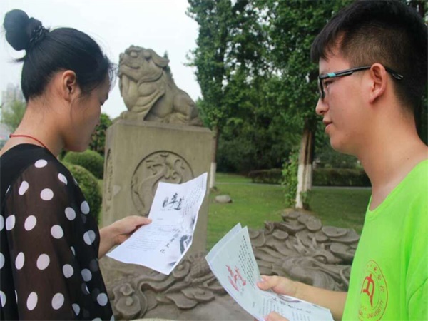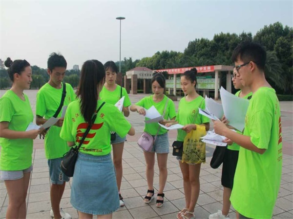 这次宣讲活动分为两个阶段,第一阶段也就是第一天主要是在大洲广场向过往民众分发孝道文化宣传单,并且向民众进行简洁的孝道文化宣传。宣传单早在活动开始的前几天就由队长袁苗带头设计制作,内容包含孝道宣传语、古诗、孝道故事等,风格古朴,字体美观大方,并彩印了百来份。全队成员身着统一的绿色队服,携带宣传单来到广场。上午在广场上活动的人比较多,非常热闹。袁苗将大家分组,到广场的不同地方去宣传,大家拿到分配好的宣传单后就立即开始行动。