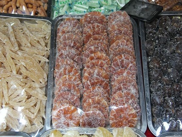 若有人问到内江的甜文化是什么,不得不提的就是内江蜜饯。内江蜜饯,又名“煮货”,它作为内江的土特产名牌,在《内江市(今市中区)志》、《内江县(今内江市东兴区)志》中均有详细记载。内江牌蜜饯品种繁多。桔饼蜜饯,色泽红亮,滋润化渣,桔味浓郁,并有止咳化痰,开胃健脾等功能。实践队一下车便径直来到天津街,这里有多家蜜饯店分布在街上的各个角落,实践队队员们决定一边走一边探访。