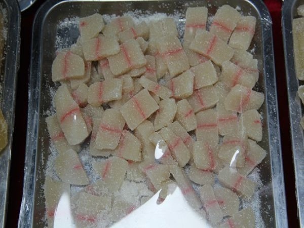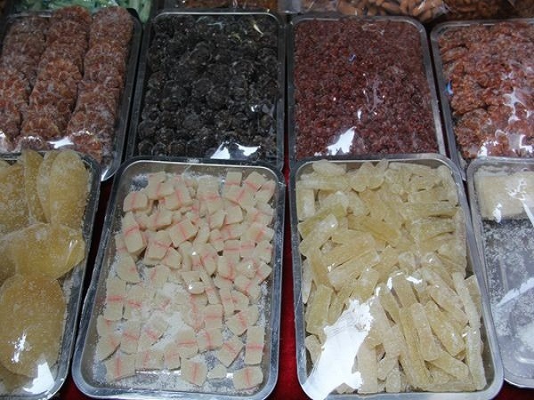很快,队员们来到天津街的第一处蜜饯店,橱窗里整齐地摆放着各色蜜饯,色泽诱人。据店主介绍,大概有金钱桔 、梨脯、杏子、寿星桔、枣子、桔红、天冬、桃子 、苹果、樱桃、冬瓜等原料做成的品种。两边的玻璃柜上还有什锦蜜饯,即集桔饼、樱桃、天冬、枣子等多种蜜饯于一盒的特色畅销礼品,这些都是店家自制的产品。遗憾的是,在实践队道出此行的目的,希望店主能分享一些制作蜜饯的工艺技巧时却遭到了拒绝。队员们都体谅店家蜜饯制作技艺不能外泄的苦衷,并没有因此气馁。当实践队来到第二家蜜饯店后,同样遭到店主的婉拒。