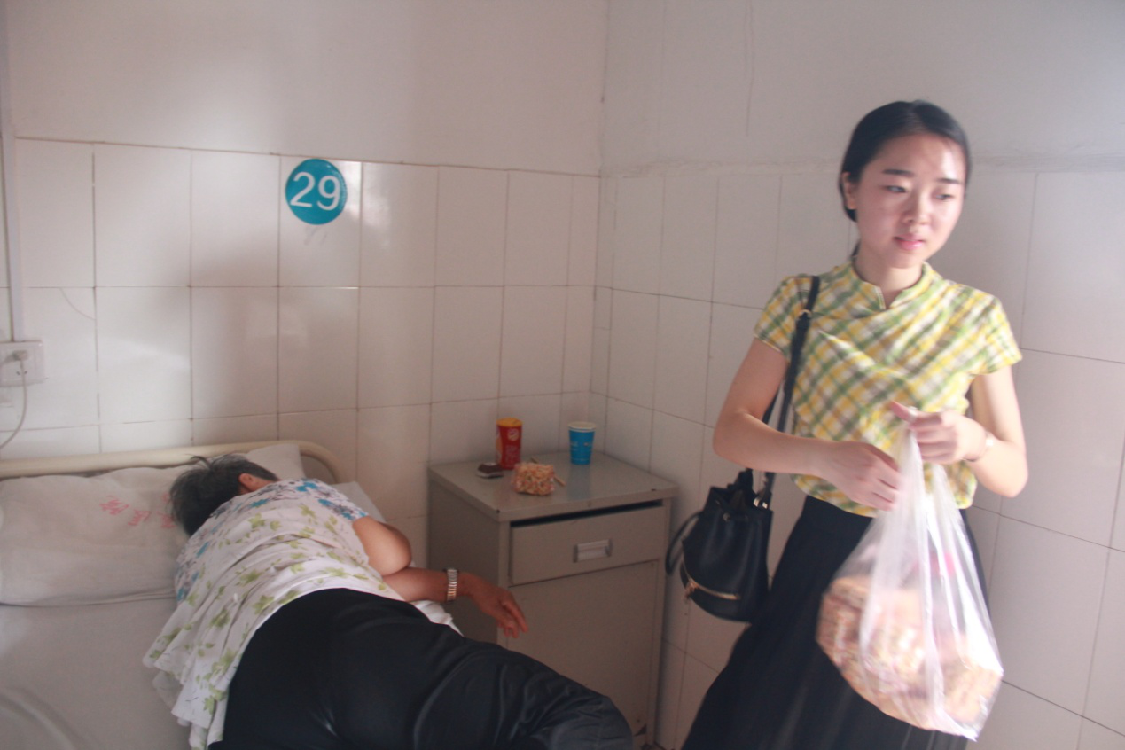 将礼品打包分装好后,全体队员于下午2点30分在公司东区门口集合,带上实践所需物资,乘坐公交然后步行至夕阳之家康复托老院。在托老院,队长袁苗首先带领队员拜访托老院赵主任,大家受到了主任以及护工人员们的热情接待,看到一股股青春活力注入了托老院,老人们也感到非常得新奇与惊喜,许多老人走出房间或高兴或好奇地探望团队一行人。然后队员们抓紧时间,分批在几位护工人员的带领下到每栋每间住房拜访老人,给他们送去礼品,为了不打扰在休息的的老人,队员们也小心翼翼地把礼品放在他们的柜子上,确保每一位老人都能够收到大家的心意。慈祥的爷爷奶奶们脸上挂着灿烂的笑容,手中紧握着东西,对队员不断道谢,说着:“简直感谢大家”、“谢谢你们来看我”等温馨的话语。礼轻情意重,能给老人们带去关爱,大家心里都觉得非常温暖,快乐。