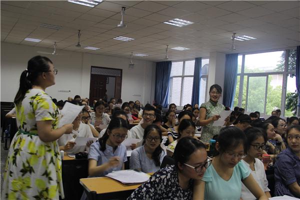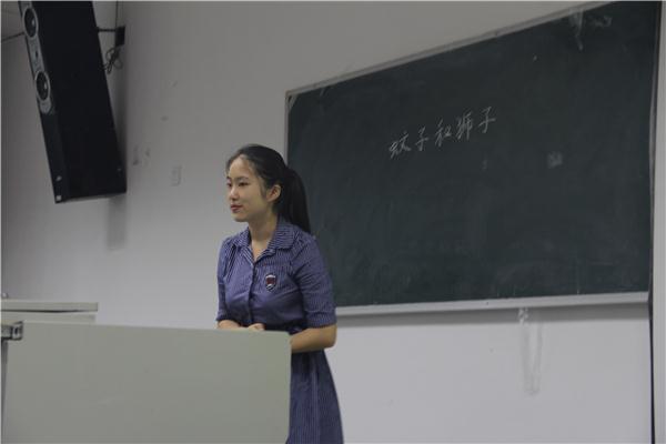 本次比赛有来自13级汉语言文学专业的曾从清、付清清、郭婷、匡星星、杜廷阳、杨厚义、胡美玲等七位同学参加,讲课内容从小学到高中,涵盖面很广。在比赛中,分说课、讲课和评委现场提问三个环节进行。七位选手依次上台进行讲课,她们在台上始终面带微笑,从容淡定。第一位上台的13级1班同学付清清为大家讲授的是《兰亭集序》,她从教学重点、情感变化以及写作特色等各个方面展开了分析和讲解,并与文中具体内容相结合,思路清晰,板书工整,得到了老师的认可和肯定。接下来,郭婷同学则通过情节了解与动画导入,用富有特色的讲解带领大家走进了沈石溪的《斑羚飞渡》的场景中。其中,来自13级2班的匡星星同学通过分角色朗读《巨人的花园》,将同学们带入了课文情节当中,活跃了课堂气氛,使教学过程也变得更加生动。每位同学都用自己其富有特色的讲课方式顺利地完成了内容的讲解,得到了在场老师们的认可,也提高了自己的讲课水平。