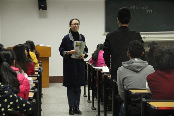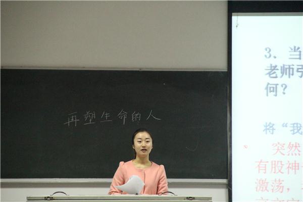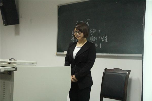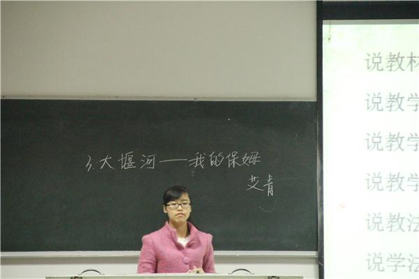 十四位参赛选手台上始终面带微笑,从容镇定。12级1班的杨敏作为第一位选手上场,仪表落落大方,授课井井有条,并与同学们一起互动,课堂气氛活跃;12级3班的倪建琼在讲课过程中,采取图片形式与课文内容紧密结合的形式,再现文章所写的景象;12级2班的曾慧通过多次朗读课文,体会文章所表达的意思,逐步深入,最后带领大家一起领悟《蚊子和狮子》的寓意……各位选手将PPT与板书相结合,从课文的字词、写作手法和情感分析等方面入手,使讲课呈现出脉络清晰、版块分明、主次有序的特点,体现了文苑学子的实践教学风采。在每位选手讲完课后都会有一位老师提问,再让选手回答,考验其反应及应对能力。 刘惠同学讲授的是小学课文《爷爷的小树》,在讲课过程中她保持着生动活泼的讲课风格,在讲授拼音和偏旁部首的时候注意到每个细节;12级2班同学杨秀通过对母爱图片的展示和分段朗读的方式为同学们详细分析了《大堰河-我的保姆》一文;13级7班的马俊梅同学作为一名专科员工,在整个授课过程中没有过多的去查看教学方案却依然把课讲得栩栩如生,得到了在场评委老师的一致好评。