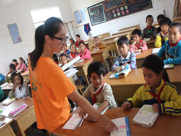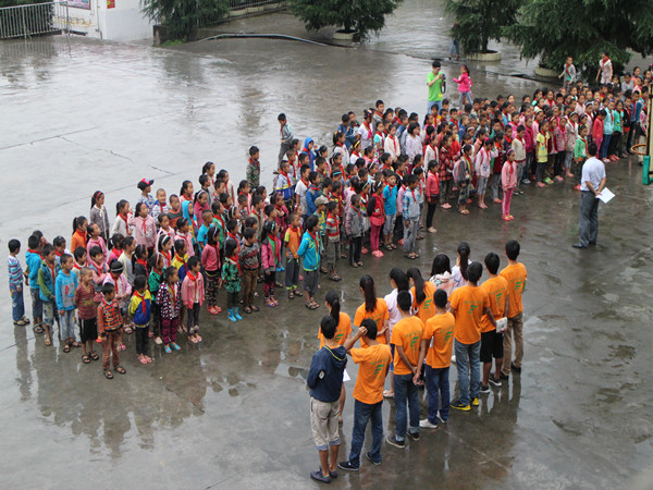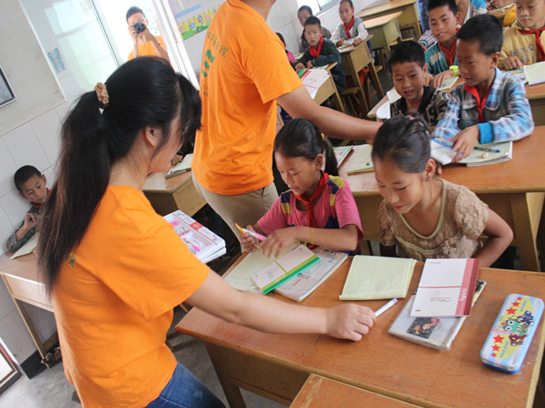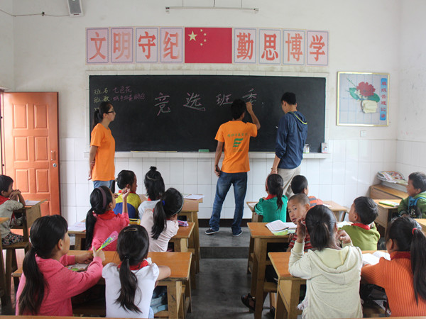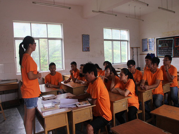 7月12日,随着董事长的哨子一响,三年级四个班与四年级四个班的员工迅速地在操场上集合。在董事长向员工们介绍我们过后,我们三人一组带一个班进入了为期一周的义务支教生涯。队员们上台做自我介绍后,便进行了点名,确认人数及到齐情况。上课开始,队员们按原计划开始选班委、定班歌、班名、班级口号,和同学们做游戏,认识对方。还教他们认简单的彝文字母和数字,接着是语文课和音乐课,在课堂上延伸和拓展他们的知识。孩子们都很懂事也十分努力,在教学过程中我们发现每个孩子都有一颗热情且大方的心。但由于语言的限制,他们不能更好的表达出来,而这也将成为我们接下来教学的主要内容。