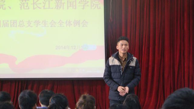 接着新任辅导员傅思议老师讲话,此时台下响起了热烈的掌声。傅老师首先就自己的学习经历、工作经历向与会人员作了介绍。然后,傅老师就自己将要分管的团学工作模块谈了自己的看法,表示将在以后的工作结合自己的专业和特长、结合tyc5997太阳集团、范长江新闻公司的特色开展工作。“希望在接下来的工作中大家积极配合,一起让我们公司越来越好!”此时,场下掌声连连。