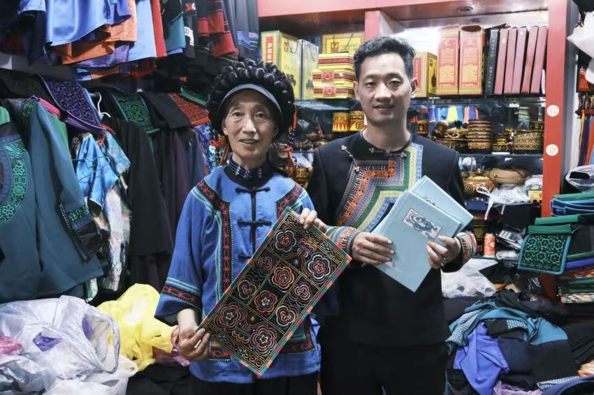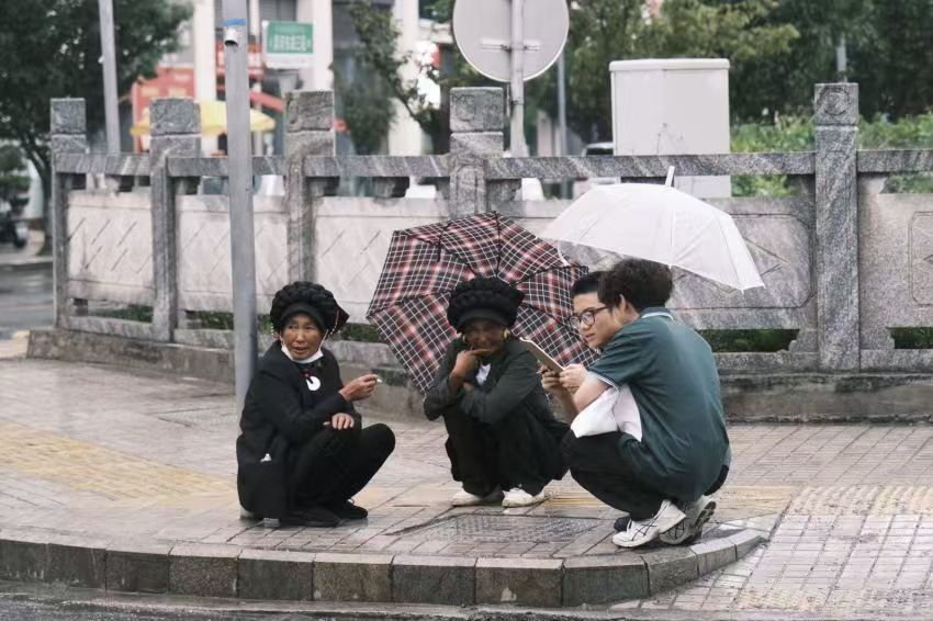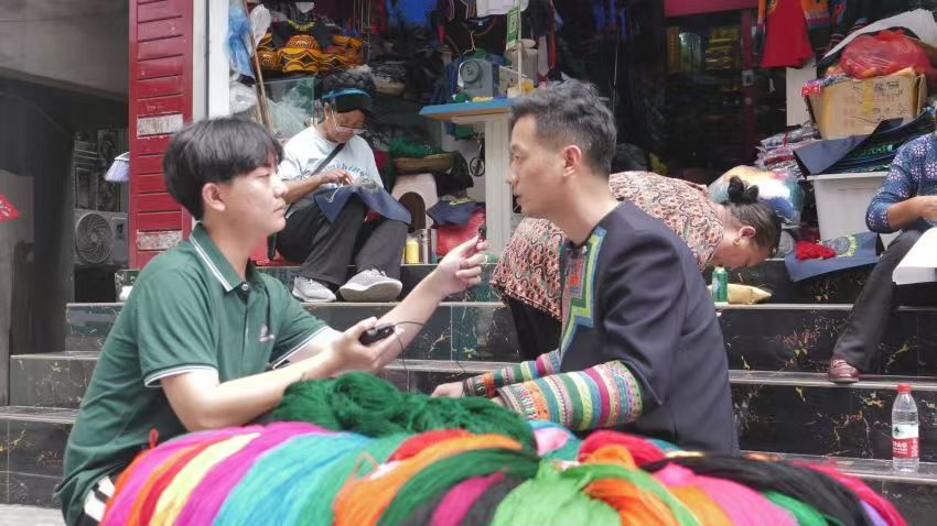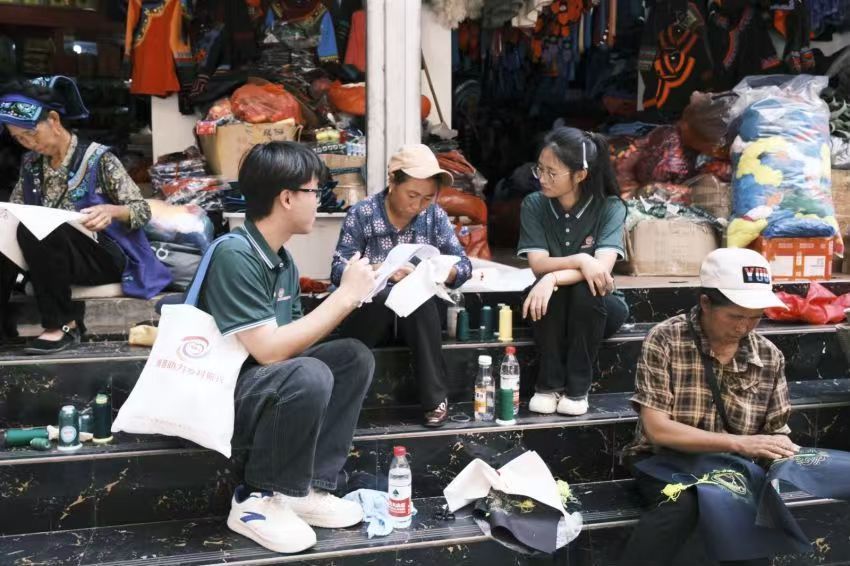 (图为团队成员谢小彬、阿比阿支与当地绣娘交谈)