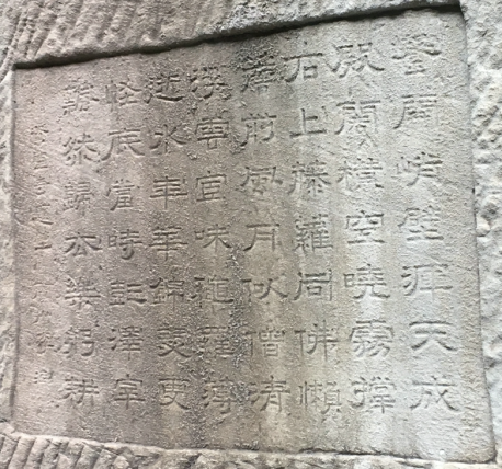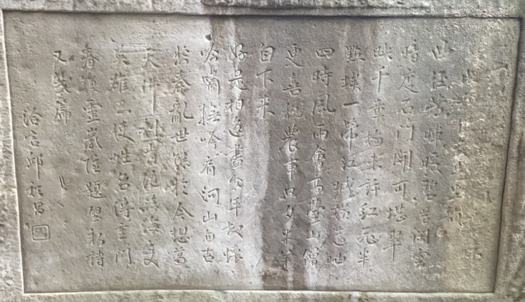 石刻内容:鑒開峭壁渾天成,殿閣横空曉霧撐。石上藤蘿同佛懶,簷前風月似僧清。浮雲宦味秋羅薄,逝水年華錦瑟更。怪底當時彭澤宰,飄然歸公樂躬耕。