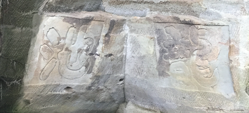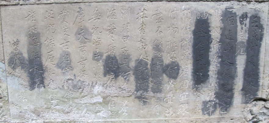 此刻位于陈鸣鸾诗刻正下方。行楷书。大部分漫漶难识,幸有白文参照,否则难以成句。诗题中“韵”字,白文识作“意”。第一首尾联对句“趺”字白文误为“跌”,盖排版致误。第二首颔联对句“磈”字,白文误识为“硯”,“磈”为“块”的异体,浇块磊为常用词组,而“硯垒”不词。颈联出句“谈深也”三字,白文误识为“情流深”,“情流深”与“景好都”不对,且观石刻字痕,除“深”字不清晰外,馀则可识。