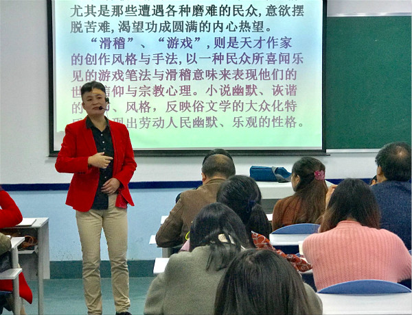 讲座伊始,冯老师幽默的说到,“论教学技巧,一线老师可能更有话语权。”在讲座开展的过程中,冯老师首先强调了阅读文本的重要性,通过对红楼梦里林黛玉进贾府时的年龄及司马光砸缸救人等古代文学故事的可信度发出疑问,指出讲课不能照本宣科,更不能抑制孩子的思维,教育是教书育人,要充分引导孩子们发挥想象力。接着,冯利华老师又带领现场学员一起探讨中国四大名著。在这个过程中,冯老师重点讲解了《西游记》,她从西游记的形成历史、书中对话特点及宗教等现象,得出了《西游记》的主题应是体现民间世俗的交易与感恩朝圣的结论。