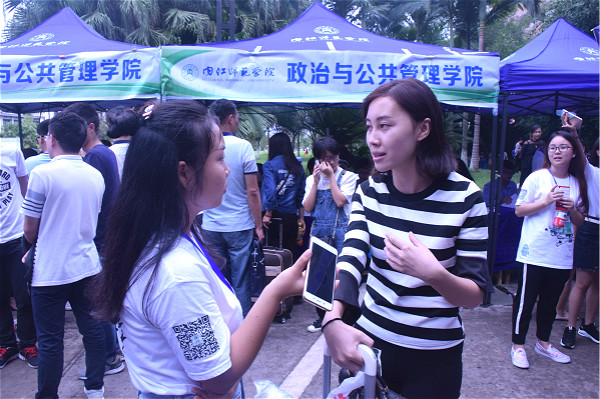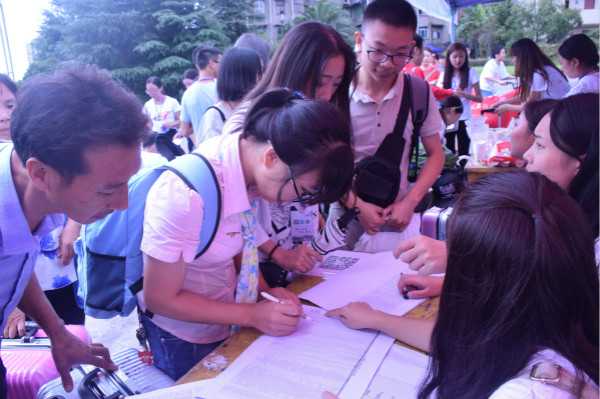 上午9点30分开始,新生陆续前来报到,志愿者们热情接待新生,帮助新生完成报道,入住寝室,志愿者们的热情服务受到了新生及新生家长的一致好评。 在与新生交流过程中,我们了解到,同学们来自五湖四海。初次到校,新生们内心激动而陌生,但是在志愿者们热情周到的帮助下,他们也放下了最初的担心,准备以一种积极的心态融入到新的环境中。