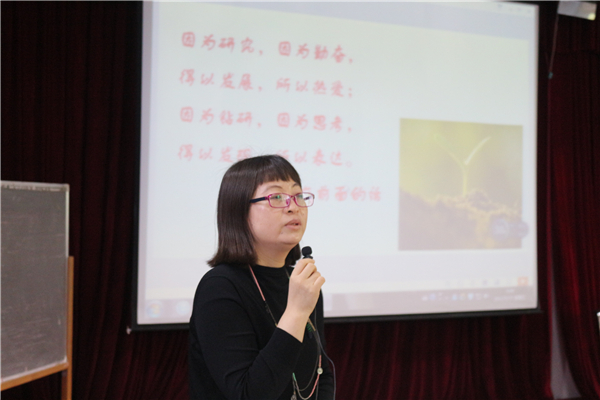 课堂伊始,李凝昕就发出了“语文是什么”的疑问。接着,李老师又结合自身的经历,以《阅读生命》为引,以《紫藤萝瀑布》和《盘古开天地》为例,讲述了语文的生命特征,从课本中引发对语文教学和自身专业化的思考。接着,李老师又运用文本解读、阅读教学、课堂建设等概念为大家讲解了语文的生态特征。李老师指出,语文与生命是水乳交融的,语文教学要倾听孩子们内心的声音,遵循生命成长的本质。我们要向传统的应试教育发出征讨,推进课程改革,致力于更本色的语文教学道路。