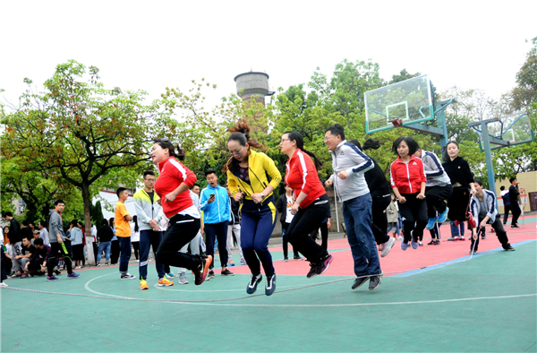 随后开始的是跳大绳比赛,共计两分钟,中途可换人。随着裁判一声令下,摇绳的老师奋力摇着大绳,大绳有节奏地上下翻飞,公司老师大多数身轻如燕、一跃而过,有的虽然节奏把握不太好,但基本上有惊无险地跃了过去。每当老师有体力不支的情况出现时,就立刻换上蓄了势待发的老师继续比赛,大家配合默契,发挥出色。最后公司以57个较好的成绩结束了比赛。