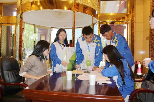 下午1点,负责接待的老师及志愿者准时到岗,等待着员工前来“报到”。在汉安酒店接待点的是康超老师、李芳老师、易晓慧老师以及五位志愿者。当员工前来签到时,志愿者首先为他们端上热茶,再细致的为他们填写信息,发放校庆纪念品、校庆晚会入场券以及餐券等物品,为他们讲解校庆的日程安排。签到环节有条不紊的进行着,各位老师和志愿者分工明确,配合默契,让返校员工都感到快捷愉悦。在签到完之后,志愿者还悉心为返校员工们办理入住手续。从下午2点到下午5点左右,30名应邀返校员工先后抵达。