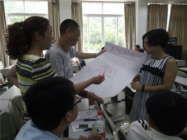 随后,卿老师又讲解了微格课备课理论,并进行预设操作。要求学员分组,以《陋室铭》作为微格课内容,设计教学内容,在小组讲课,并派代表在班上展示讲解,其他学员点评。学员们参与热情很高,都积极进行讨论。最后把讨论结果写在了一张白纸上,面向全体学员进行展示。