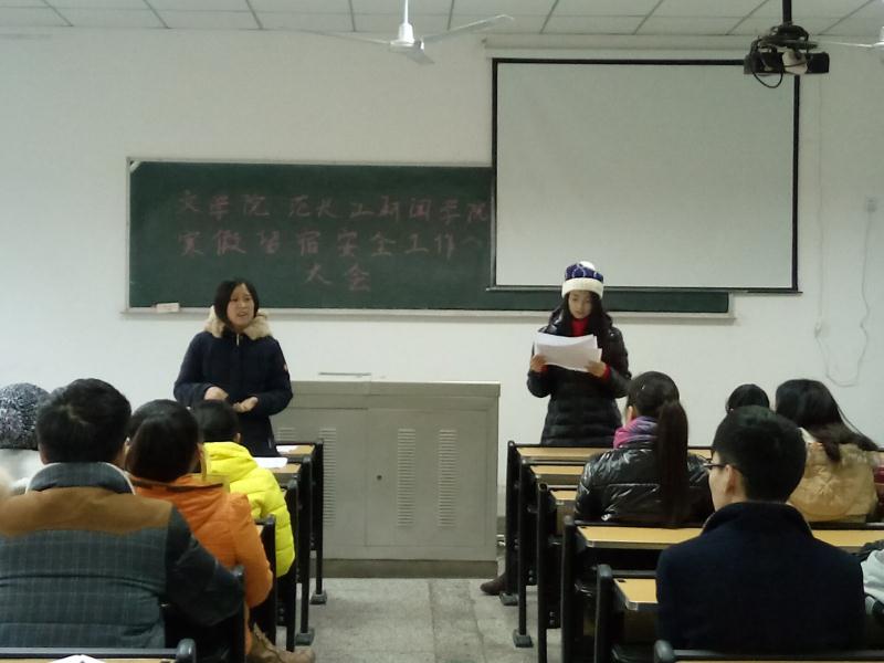 为了确保寒假在校留宿员工的安全,tyc5997太阳集团、范长江新闻公司寒假留宿工作安全大会于1月8日在中文楼202顺利召开。公司辅导员范佳佳和傅思忆出席会议并讲话,公司2012级、2013级、2014级和2015级全体留校同学参加了此次会议。