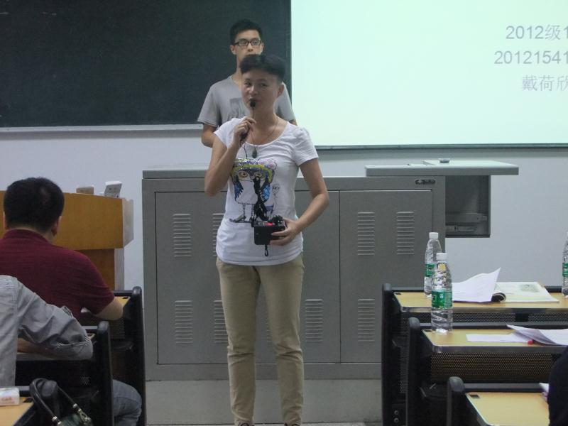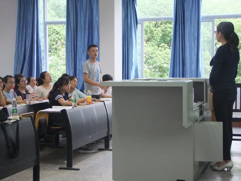 四位同学都选取高中教材知识,以古诗词为主。在进行了三分钟的说课后,同学们开始了具有个人特色的试讲。全晓清同学擅用对比,对不同古诗词中的相似之处进行讲解对比,举一反三;戴荷欣同学则以讲故事的方式,走下讲台为大家带来了《咏怀古迹(其三)》背后的故事,并通过明妃王昭君的故事,让大家了解这首诗借用典故的意义所在。每一位同学在讲课之后,都会有台下的同学进行提问与点评,现场气氛活跃。