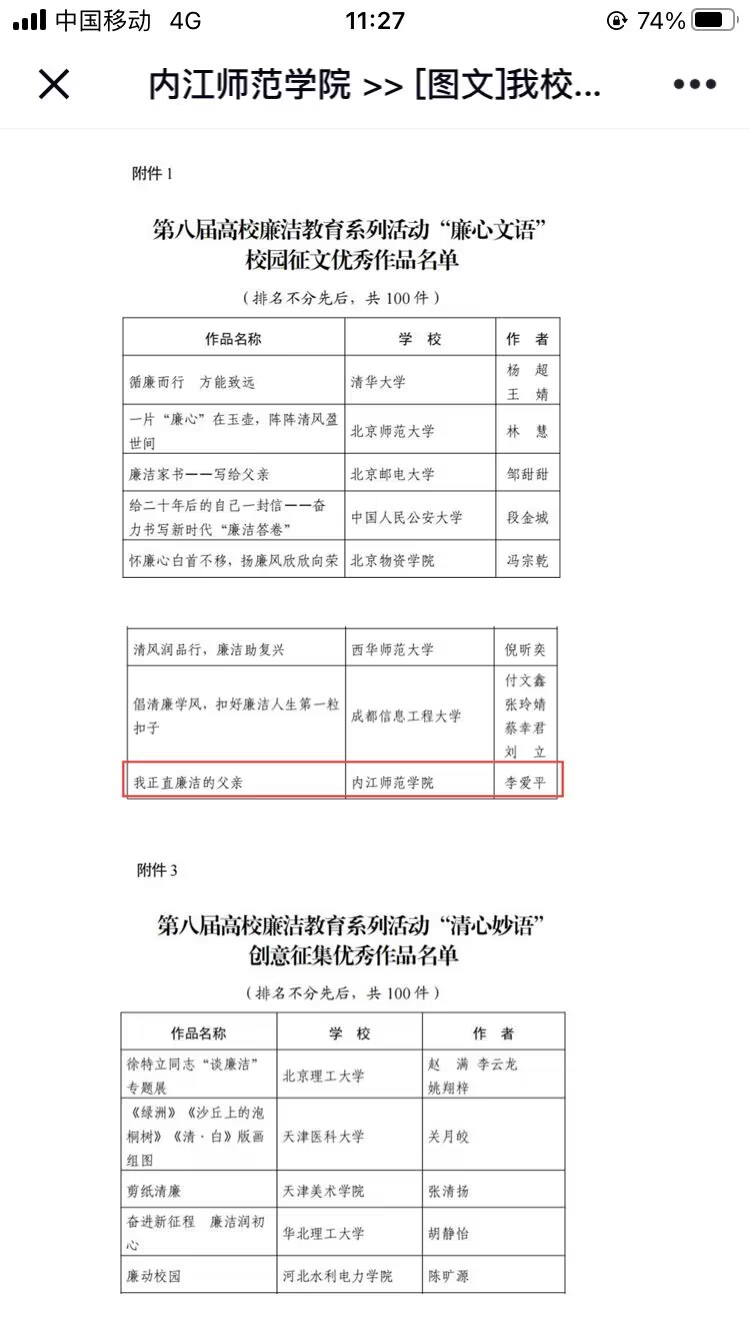 近日,第八届高校廉洁教育系列活动在各校各地开展,本次活动以“廉洁润初心,铸魂担使命”为主题,旨在深入学习贯彻党的二十大精神,贯彻落实党中央《关于加强新时代廉洁文化建设的意见》,围绕落实立德树人根本任务,纵深推进高校全面从严治党。公司李爱平老师的文学作品《我正直廉洁的父亲》在此次比赛中被评选为优秀作品。