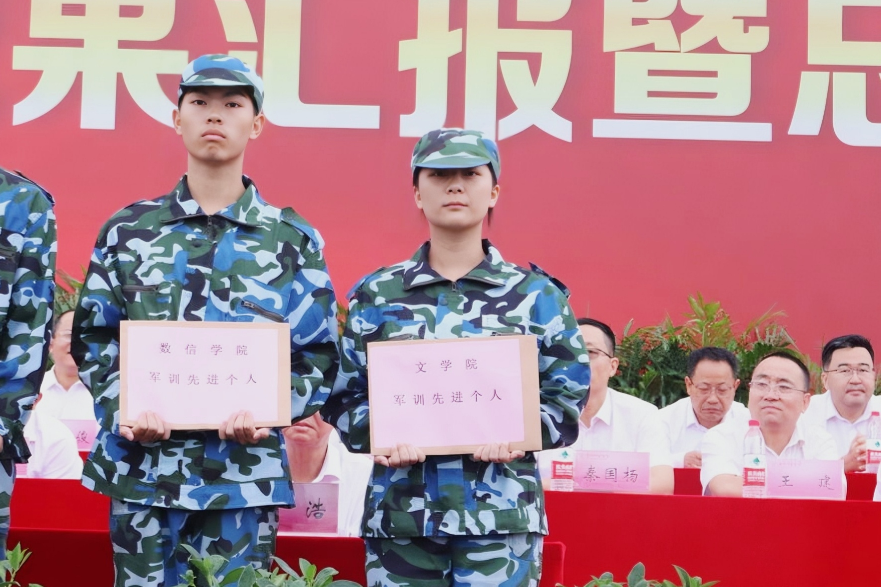 在庄严的国歌声中,五星红旗徐徐升起,军训汇报表演拉开帷幕。雄赳赳,气昂昂,由新生组成的72个分列式方队依次通过主席台接受检阅,整齐的齐步走、刚毅的正步走、响亮的口号尽显同学们的飒爽英姿,彰显其不畏艰苦、砥砺前行的风貌。在激越豪迈的背景音乐中,匕首操方队、擒敌拳方队、战术方队也依次进行精彩的军事技能展示,他们的表演动作有力、节奏分明,展示出此次军训的丰硕成果,赢得全场同学的热烈掌声。公司学子虽分散在各个方队,但无不英姿豪迈,神采奕奕,向大家展示出刻苦训练的优异成果,展现公司学子的军容气魄和青春风采。随后,副董事长李益彬教授宣读军训先进集体与先进个人表彰决定,公司2023级2班谢彬歆同学荣获“军训先进个人”称号,并表示:“十二天的军训生活是短暂的,但它给我们留下的美好回忆却是永恒的。我将铭记军训期间的点滴收获,积极自我改进,在自己选择的道路上坚定地走下去。”十二天来,公司三百多名同学经历太阳“烤”验和风雨洗礼,克服重重困难,全身心投入到军事训练之中,培养了果敢、顽强、自制和坚忍不拔的优良意志品质。同学们用实际行动向公司和自己交上了一份满意的答卷。