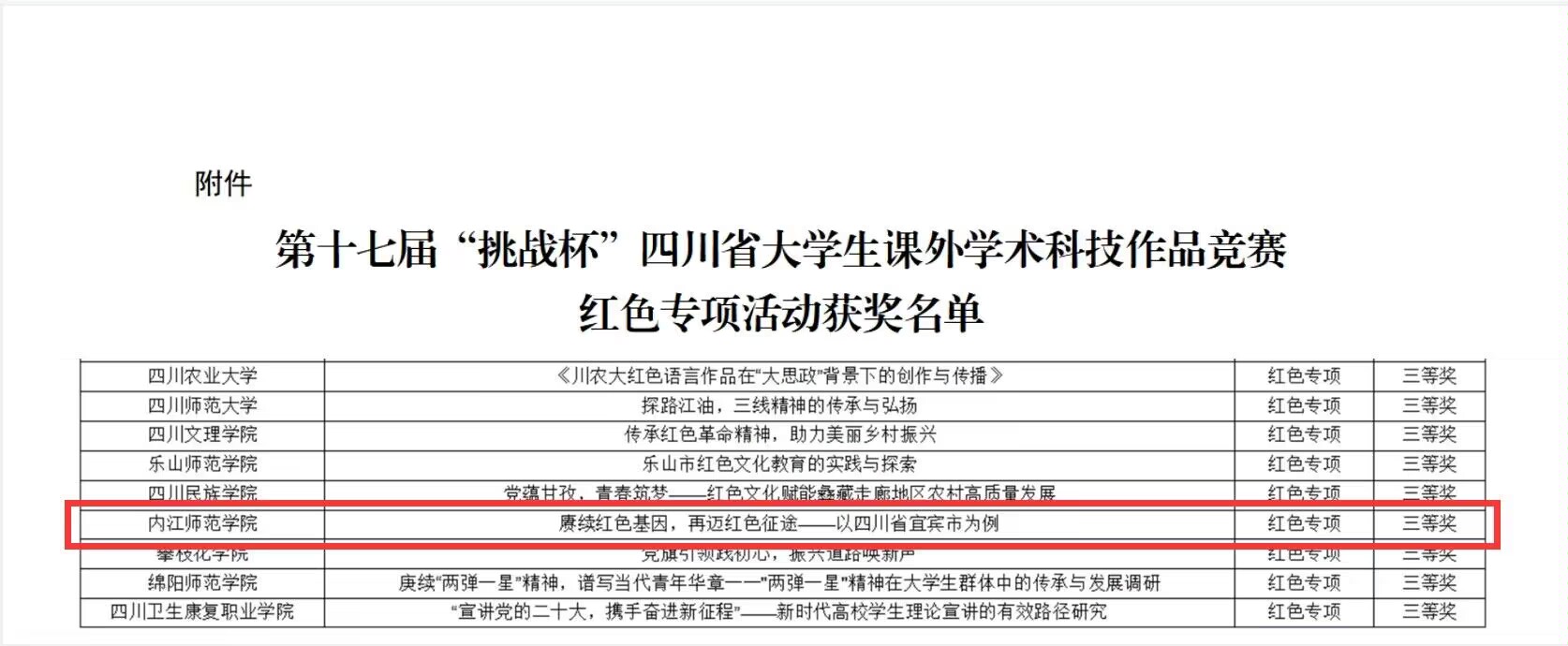 近日,由共青团四川省委、中共四川省组织部、四川省科学技术协会、四川省教育厅主办,第十七届“挑战杯”四川省老员工课外学术科技作品竞赛在成都大学圆满闭幕,tyc5997太阳集团余霞老师、校团委陈怡君老师指导的作品《赓续红色基因,再迈红色征途——以四川省宜宾市为例》喜获四川省红色专项活动三等奖。