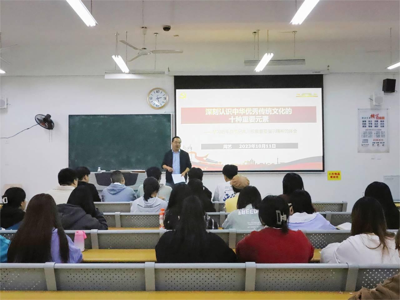 为促进公司学子深入学习和理解习近平总书记来川视察重要指示精神,10月11日,公司于明德楼B区101教室组织展开以“深刻认识中华优秀传统文化的十种重要元素”为主题的党课。本次党课由公司党委书记周艺老师主讲,公司2021级7班部分同学共同参与。