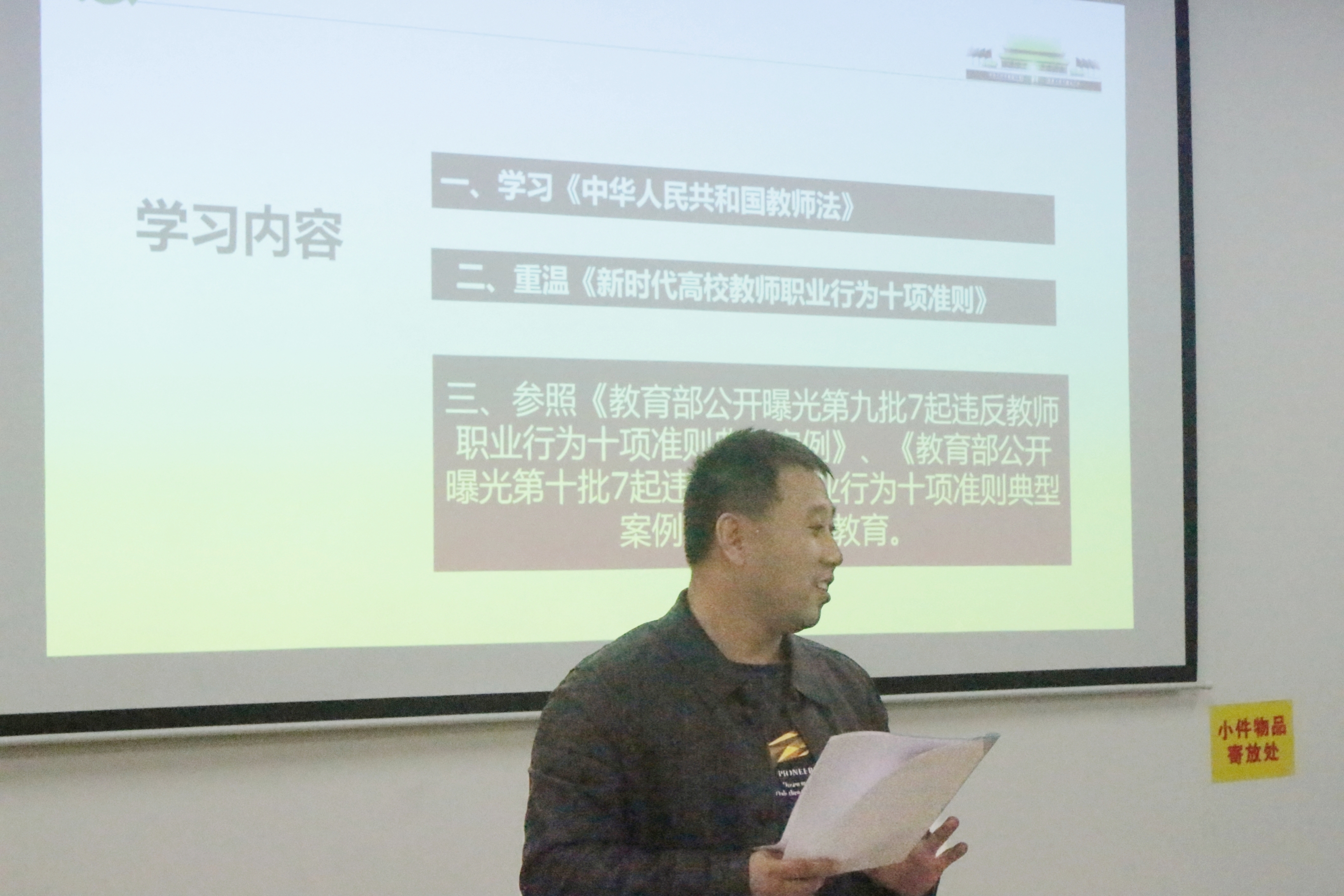 会议伊始,周书记带领各位老师学习了《中华人民共和国教师法》,重温了《新时代高校教师职业行为十项准则》,参照《教育部公开曝光第九批7起违反教师职业行为十项准则典型案例》、《教育部公开曝光第十批7起违反教师职业行为十项准则典型案例》开展了警示教育,并向全体教职工强调了师德师风建设的重要性。