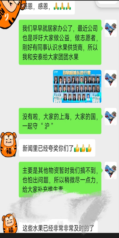 “志愿者第一时间把苹果给老人送了过去,其他收到香蕉的小区居民也很激动。”张倩说。张倩和同事们白天工作,下午线上办公一结束,就帮助小区居民组织团购,配送团购物资。每每物资派送完毕都已经是深夜了,有时候还会为了第二天的物资讨论到凌晨两点,虽然疲惫,但是大家乐此不疲。她说:“我们接触的抗疫场景就是当时上海全面抗疫的一个缩影,还有各行各业的人员、无数的志愿者比我们更辛苦。就拿全国各地来支援的医护人员来说,江浙沪的医护,当天来,当天返回,冒着随时可能感染的风险支援疫情严峻的上海,防护服一穿就是一天,让我真的很敬佩、很感动。”