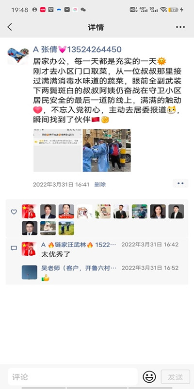 随着封控时间的延长,疫情形势严峻,张倩所在小区陆续出现新冠病例。第一个病例是志愿者家庭,小区居委紧急遣散志愿者,进行消杀,安排志愿者居家隔离。居家自我隔离期间,张倩发现,封控时间的延长,导致居民生活物资需求越来越多,很多小区居委人员、渠道有限满足不了大家的需求。因此,各个小区开始出现团购,“上海团长”应运而生,“上海团长”在本轮上海疫情的抗疫物资保供中起到了重要作用。张倩所在的公司——上海链家,倡导员工们积极投身到抗疫中做志愿者,张倩便和门店同事一起建立微信群帮助大家,起初是为一些老年人提供生活基本物资配送服务。