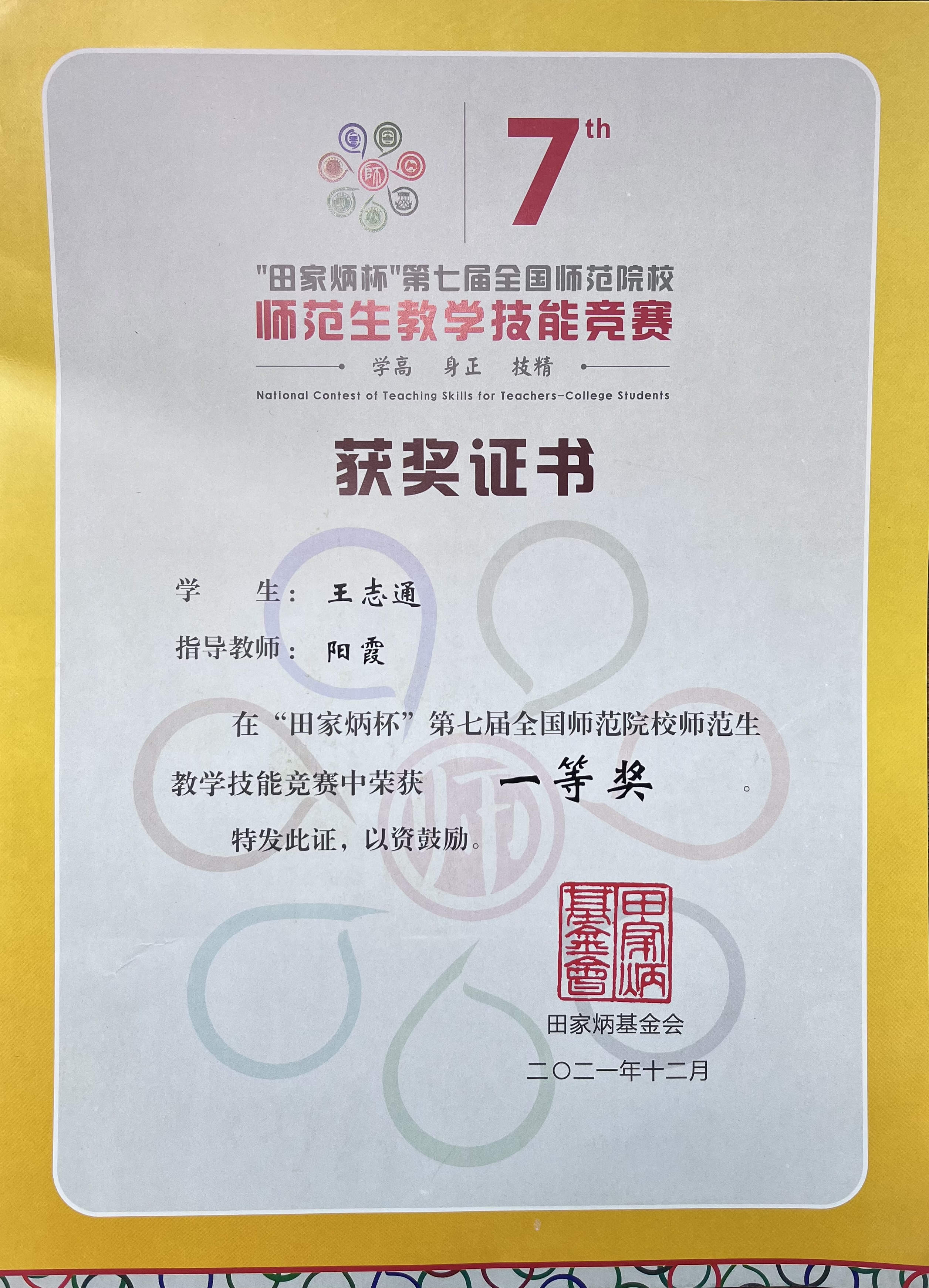 在12月27日至29日举行的 “田家炳杯”第七届全国师范院校师范生教学技能竞赛决赛中,公司2018级4班王志通同学在公司副教授阳霞老师的指导下斩获全国一等奖。