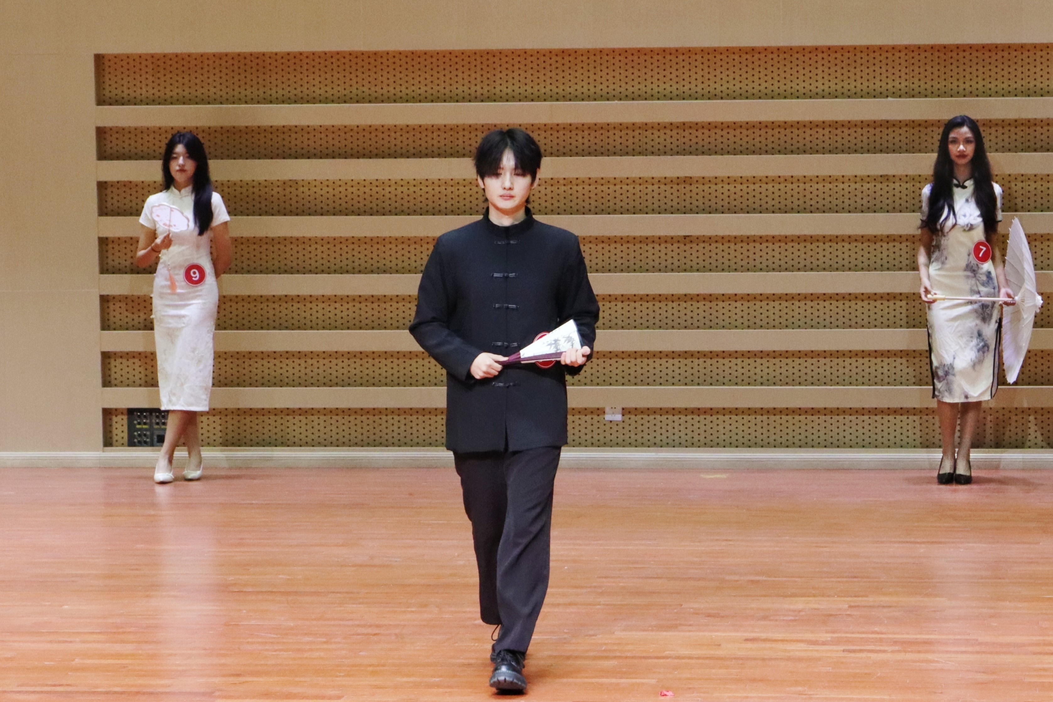 本次比赛分为新中式服装展示,搭档展示,公司展示三个环节。第一轮新中式服装展示中,公司学子以黑色中山装与旗袍亮相,传统与时尚的碰撞,现代与国风的融合,中国传统服饰配上悠扬婉转的音乐,尽显东方之美。第二轮搭档展示,随着音乐的律动,选手两两组队,依次从舞台侧面走到中间,摆出定位造型。不仅表现了自我的风采,同时也展现了组合之间的默契与配合。第三轮以公司为单位进行展示,公司学子身着极具设计感的服装,踏着沉稳的步伐,带着自信的微笑,展示了在服装搭配、形体仪态、精神风貌等方面的魅力和活力,赢得了观众的喝彩和评委的认可。最后,评委对本次比赛及参赛选手做出了点评。经过两个多小时的精彩角逐,公司张修铭荣获冠军。