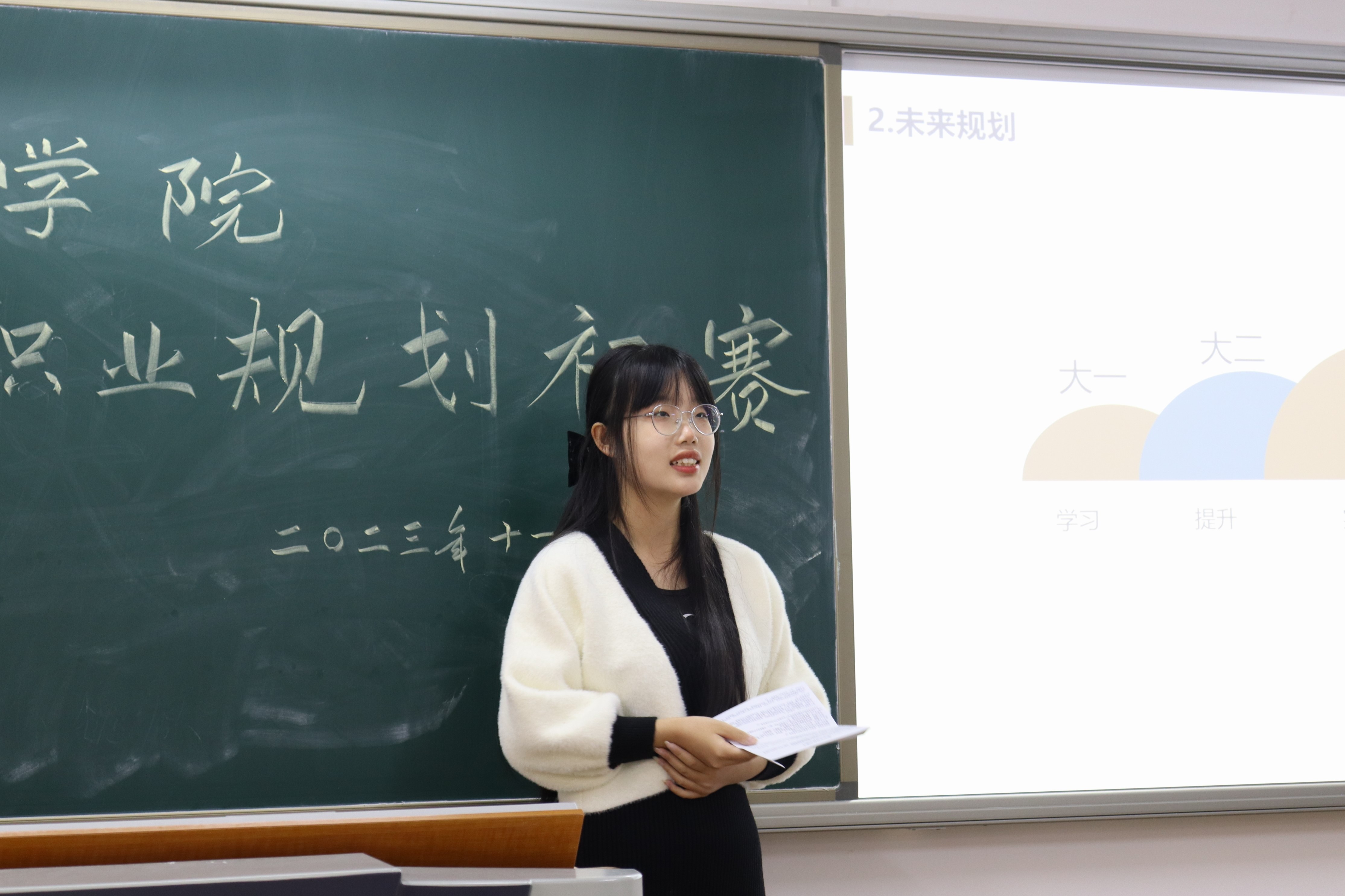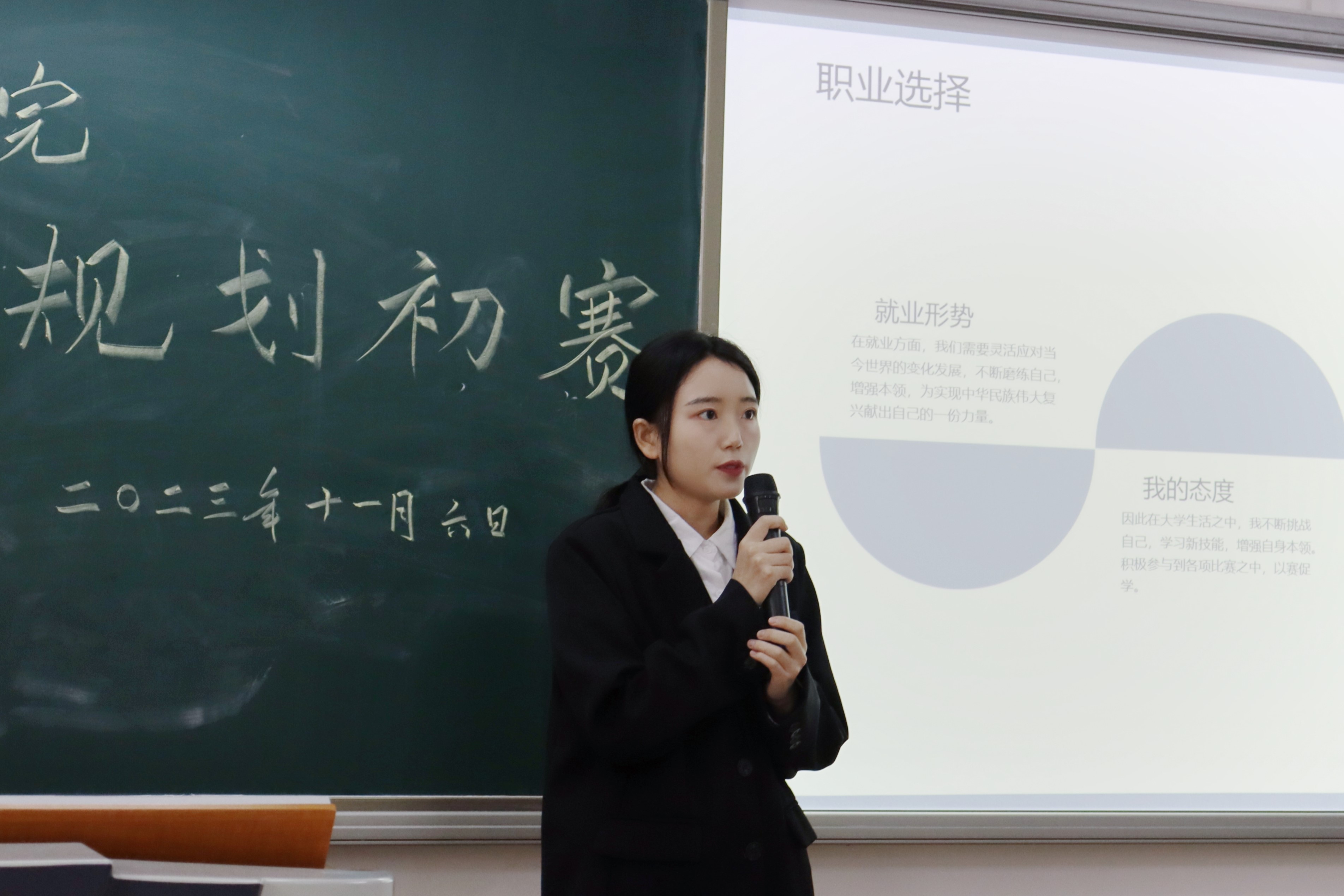 大赛分为成长赛道和就业赛道,先由选手进行自我展示演讲,再进行评委点评,优胜者将参加校级比赛。在自我展示环节,选手们全面展示了自己的职业规划理念、目标和实施策略,向评委们呈现出一个个充满个人特色的职业生涯规划蓝图。其中,杨文馨同学以教育为切入点,用声情并茂的演讲,展示了自己的清晰的职业生涯规划,赢得了评委们的赞赏。