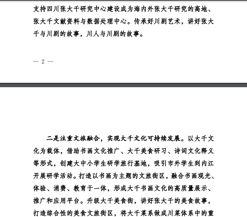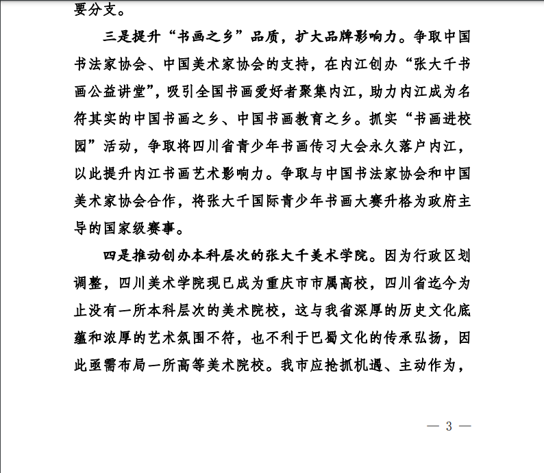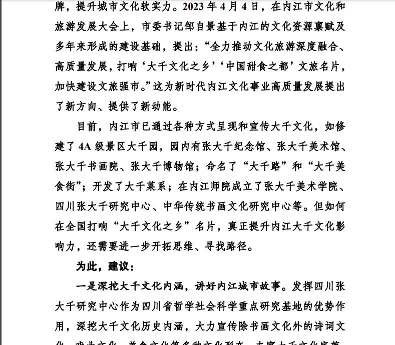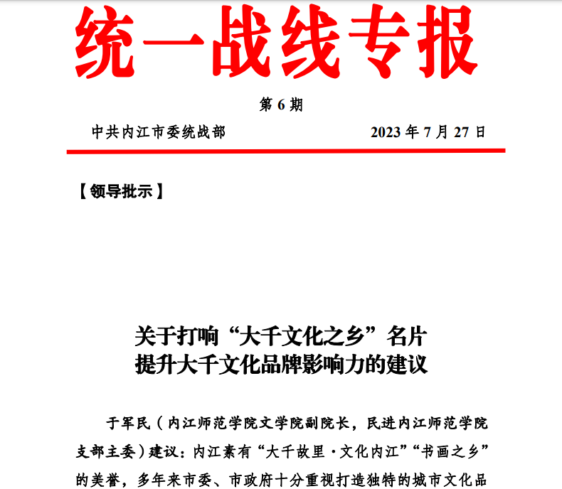 近日,公司副经理于军民教授的调研报告《关于打响“大千文化之乡”名片提升大千文化品牌影响力的建议》被中共内江市委统战部遴选为第6期统一战线专报,送呈市委、市政府主要领导。该报告认为,市委提出建设文旅强市奋斗目标,将打响“大千文化之乡”这张文旅名片作为主抓手有深远意义。当下亟需对“大千文化之乡”的丰富内涵进行深入挖掘和充分阐释。张大千是行走的巴蜀文化和中华优秀传统文化。我市要在已有大千文化建设基础上,深挖大千文化内涵,讲好内江城市故事;创建大千文化大中小员工研学旅行基地;打造大千书画文旅街区、美食文旅街区,讲好张大千与川剧的故事;创办高水平的书画展会和赛事;创办“张大千书画公益讲堂”;出台人才政策,支持高水平书画人才和研究队伍落户内江,为擦亮“大千文化之乡”的文旅名片提供人才支撑。