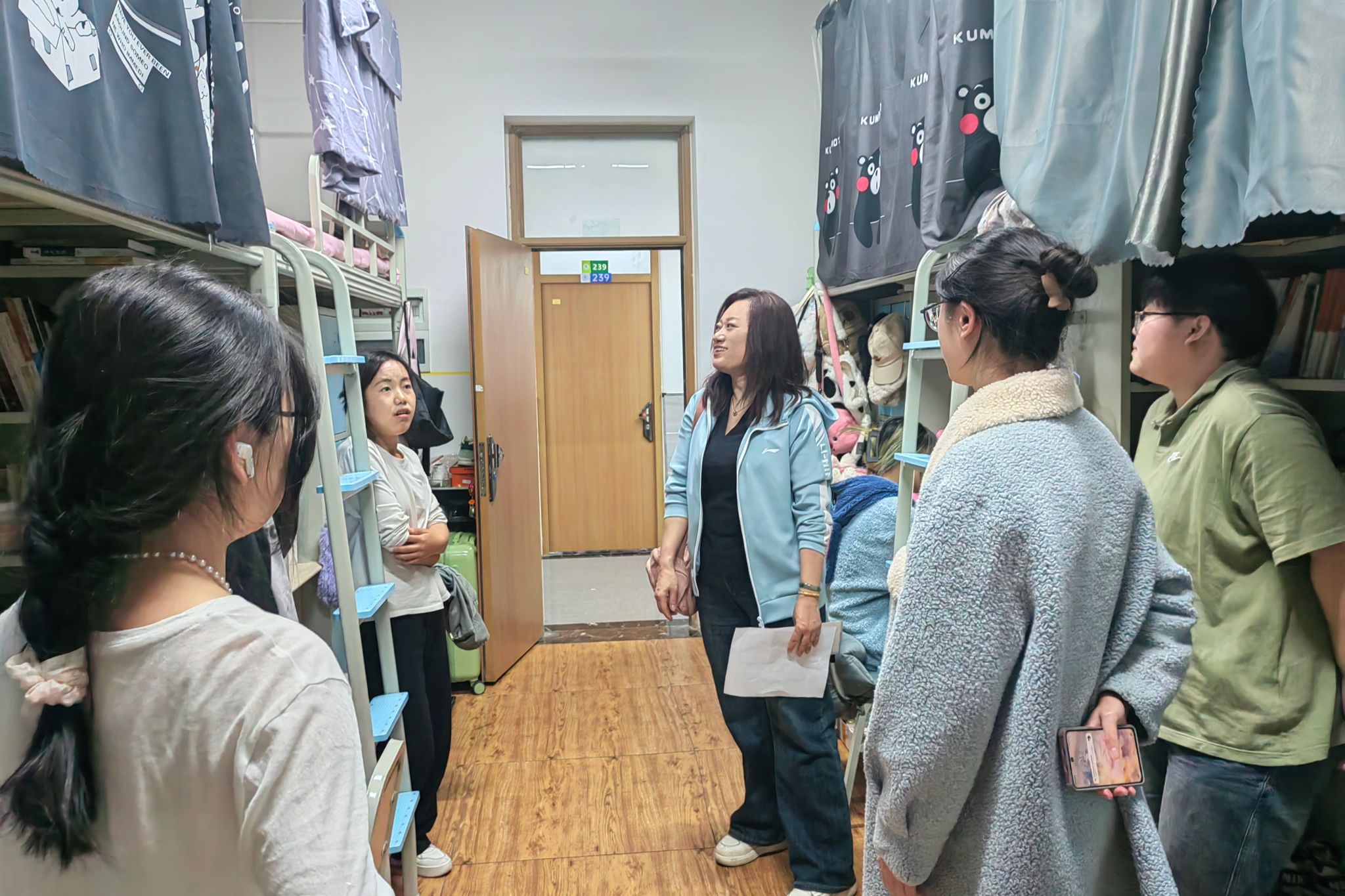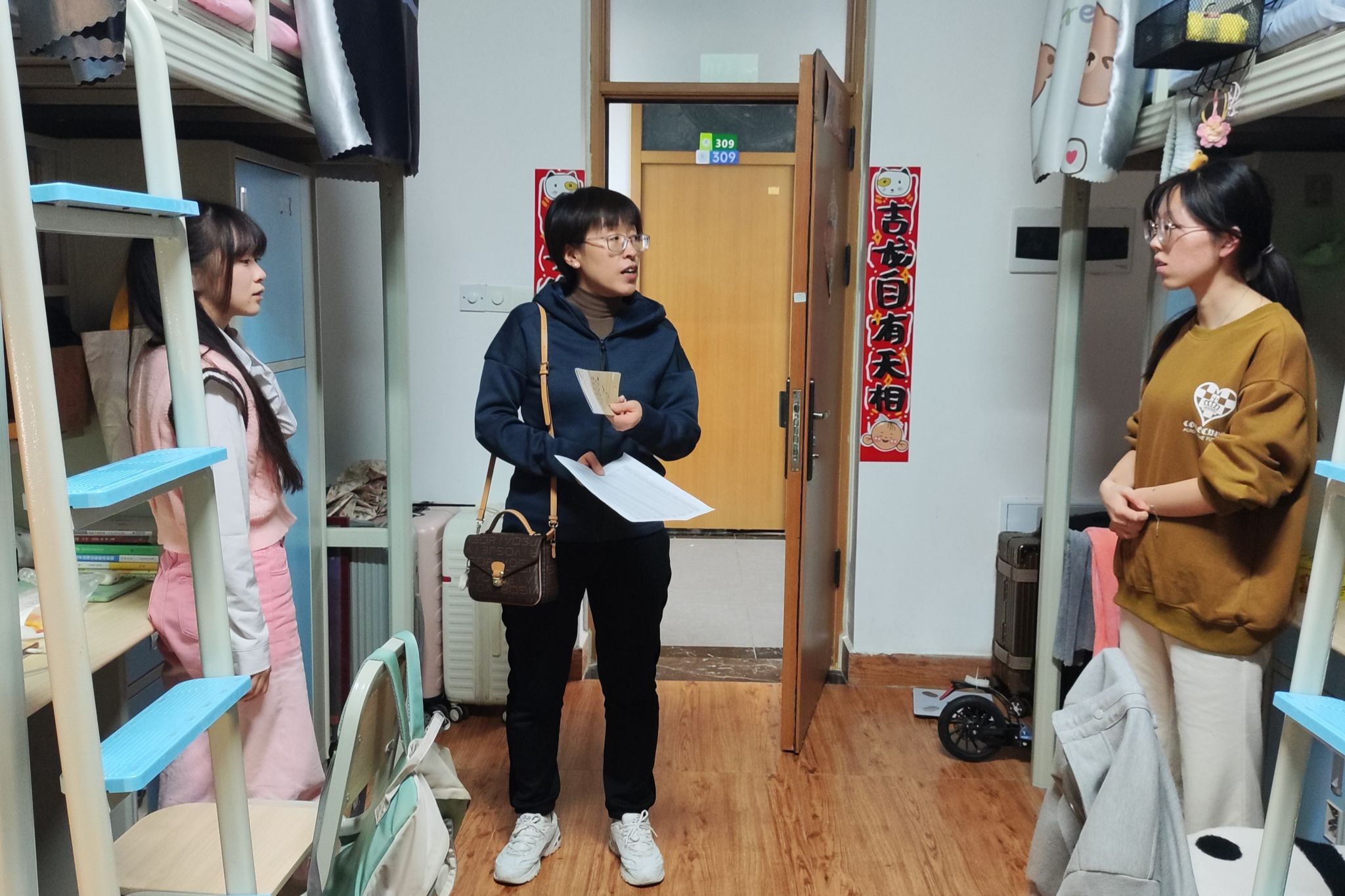 活动中,领导与老师们走进公司员工宿舍进一步了解和关心了同学们的宿舍生活情况。在走访过程中,老师们强调了宿舍的消防安全、内务整理等事宜,并对环境卫生好、宿舍氛围活跃的宿舍进行了表扬,对存在问题的宿舍提出了整改建议并予以鼓励。周书记表示,希望同学们能自觉培育和践行社会主义核心价值观,积极参与星级文明寝室创建,以军训标准做好寝室内务卫生,为打造有品质的校园生活贡献力量。同时,各位老师还与员工就学业进展、未来规划、心理状态等方面进行了深入交流。其中,梁经理叮嘱同学们注意天气变化和个人防护并鼓励员工积极做好目标规划,以更好的状态迎接新的挑战。紧接着,刘书记重点强调大家要重视宿舍防火安全,她要求同学们在寝室无人的情况下必须切断所有电源,尤其是插座,做到“人走断电”,同时也要禁止在宿舍里使用大功率电器,时刻注意用电安全,排查消防隐患。