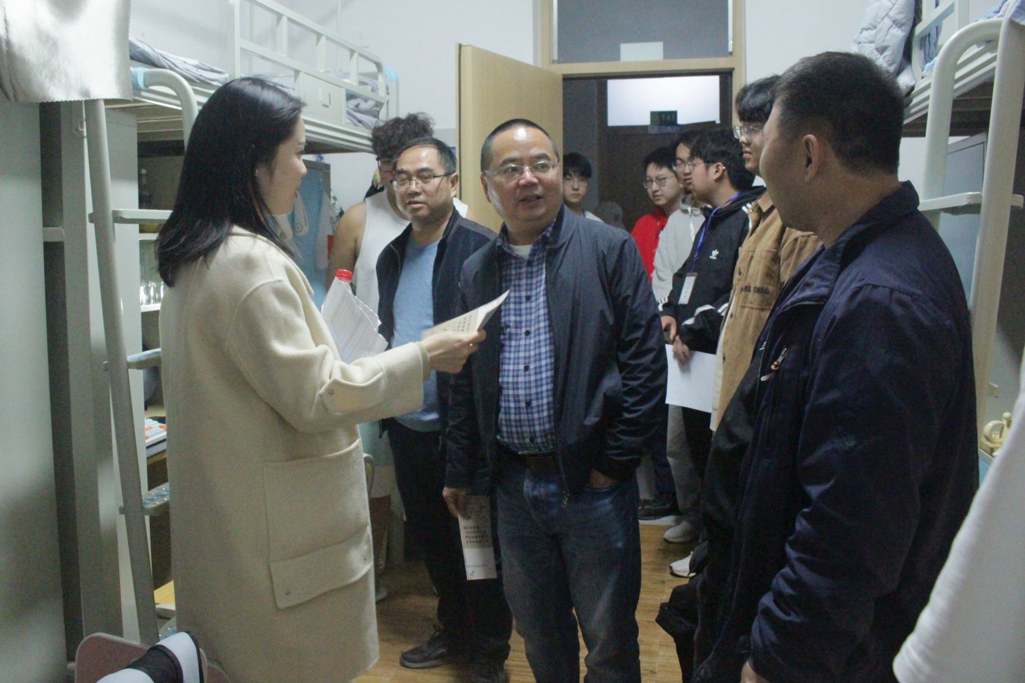 为了解员工的思想动态、学习生活和宿舍情况,深入推进公司产品改革,全面迎接新一轮本科公司产品审核评估工作,3月21日晚上7点,公司于tyc5997太阳集团各员工宿舍组织老师走访寝室并进行本科公司产品审核评估宣讲,参与人员为公司党委书记周艺,党委副书记、副经理(主持工作)梁明玉,党委副书记、纪委书记刘正丽,副经理于军民,经理助理王昕以及辅导员和班主任们。