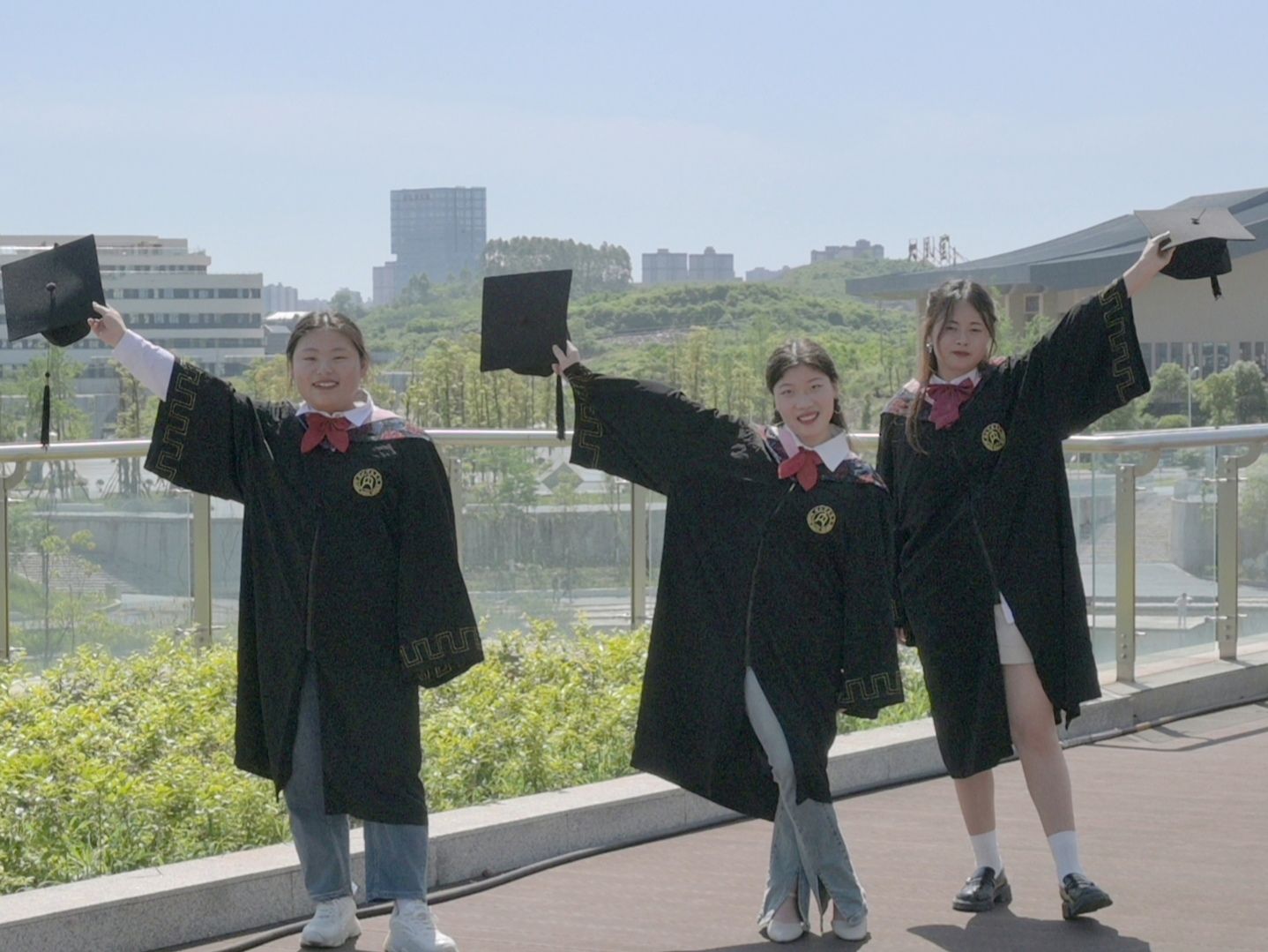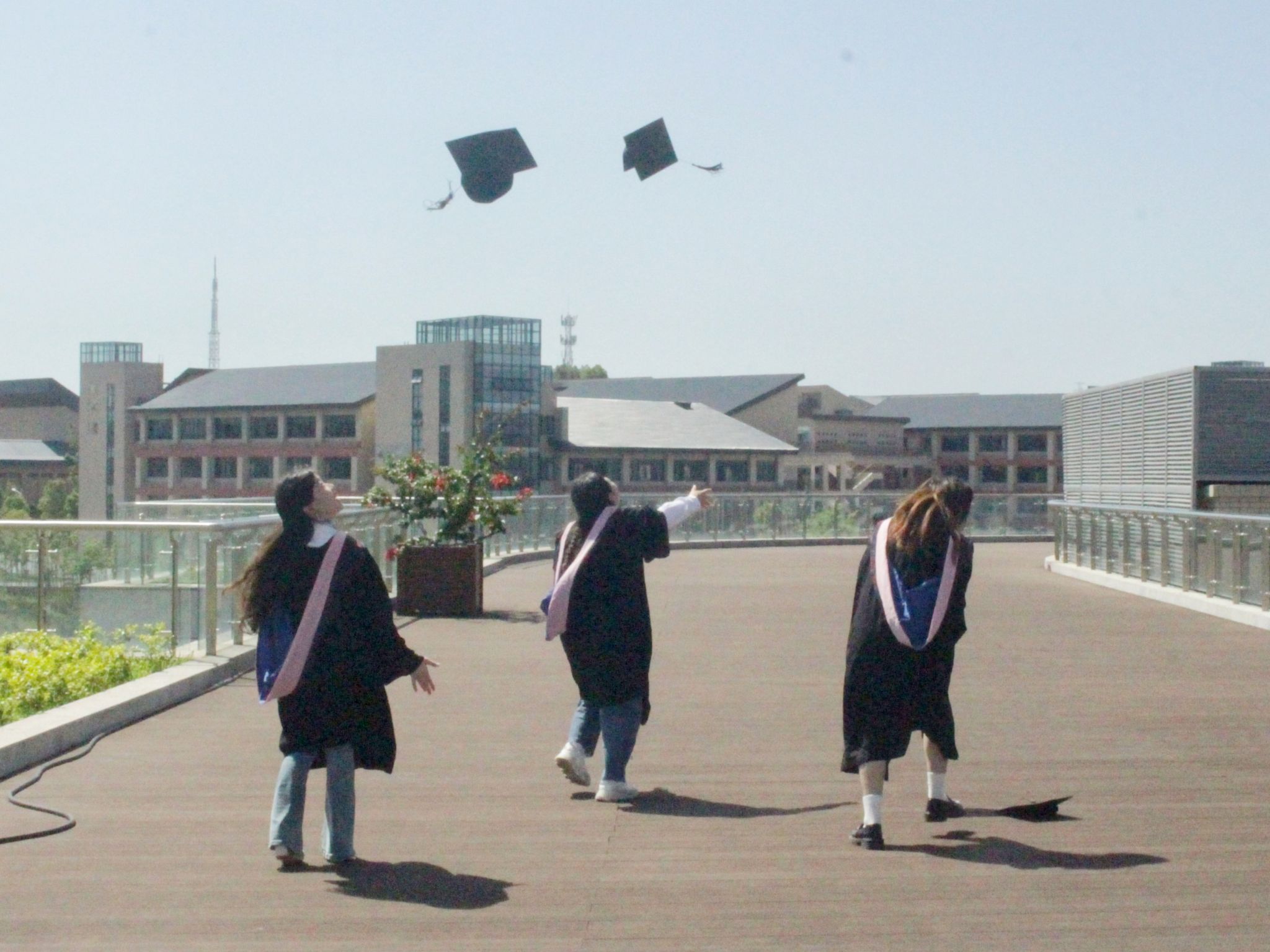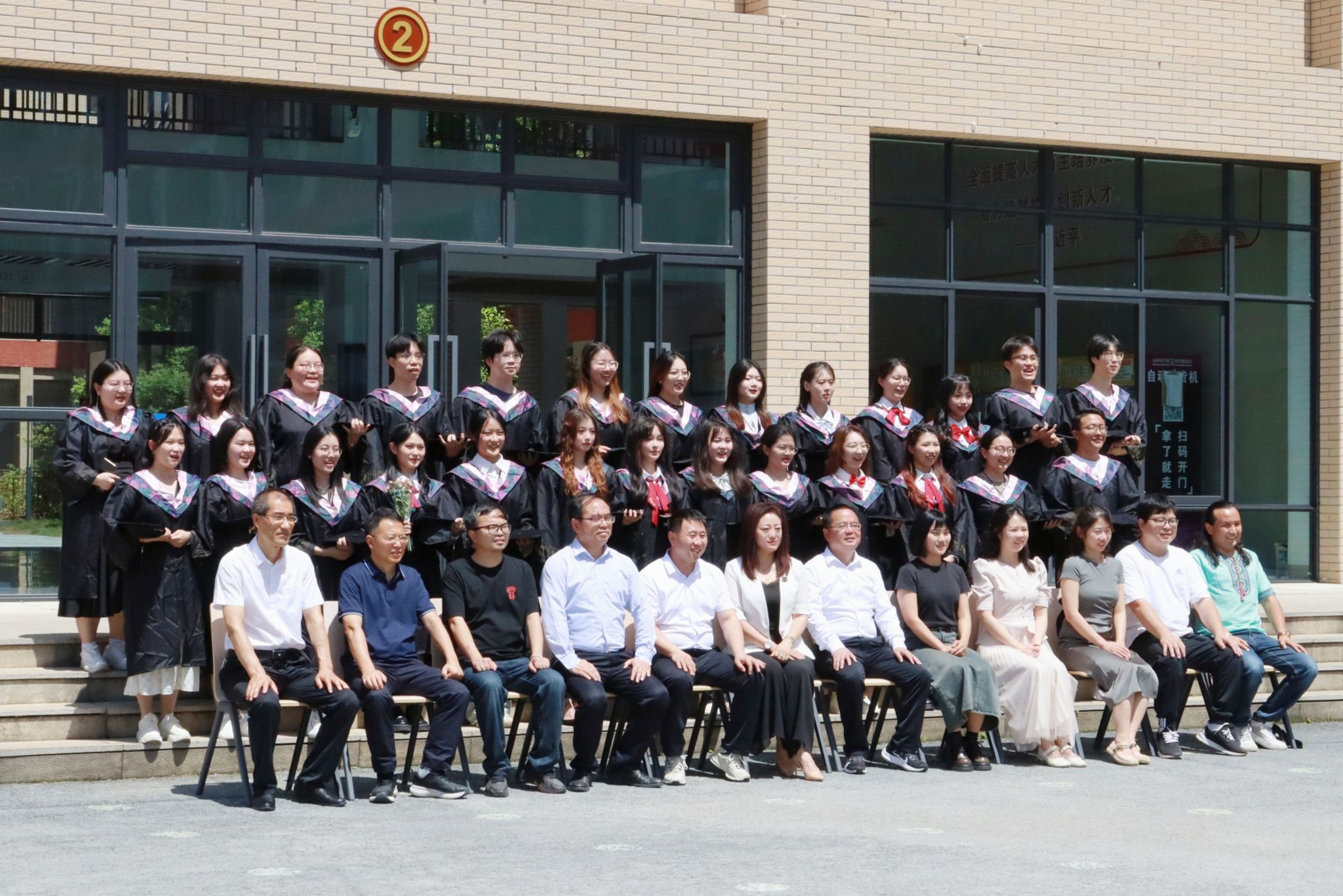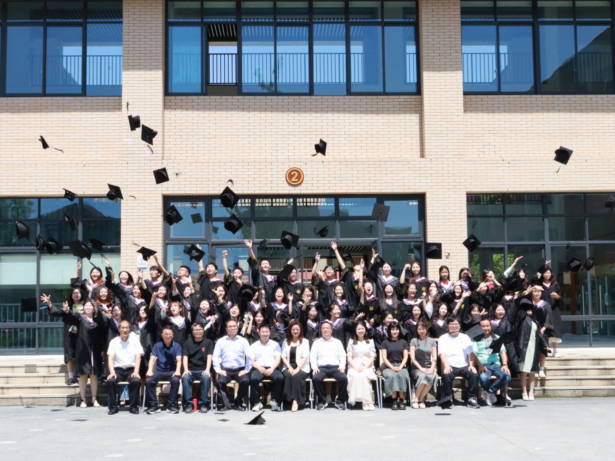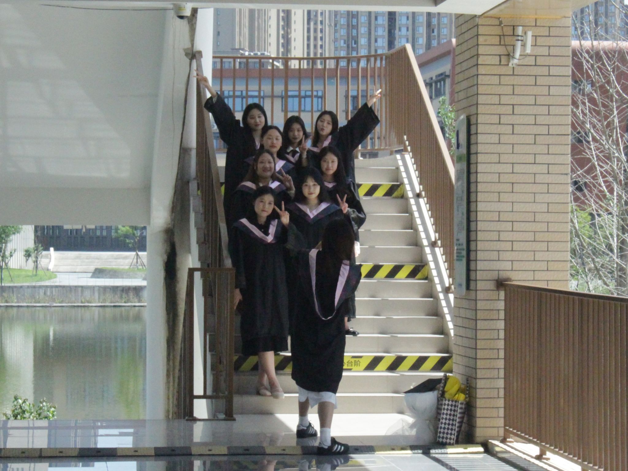 拍摄过程中,毕业生们统一身着学士服,一排排站在阶梯上,摆出各种别有创意的造型,身前是亲切的恩师,身后是熟悉的教学楼,阳光正好,伴随着“咔嚓”的快门声,时间定格在了这一瞬。“学其成时念吾师”,拍摄结束后,同学们热情地邀请公司领导、老师们合影,借此传递对老师的感激与祝福,并表示未来将会以更优异的成绩回报母校。随后,毕业生们三五成群,与自己的好朋友拍照留念,楼梯口、文津湖、图书馆……他们的足迹又一次覆盖上公司的地图。鸟啼虫鸣,鲜花正盛,校园的一草一木也同难忘的大学时光一起被装入照片。