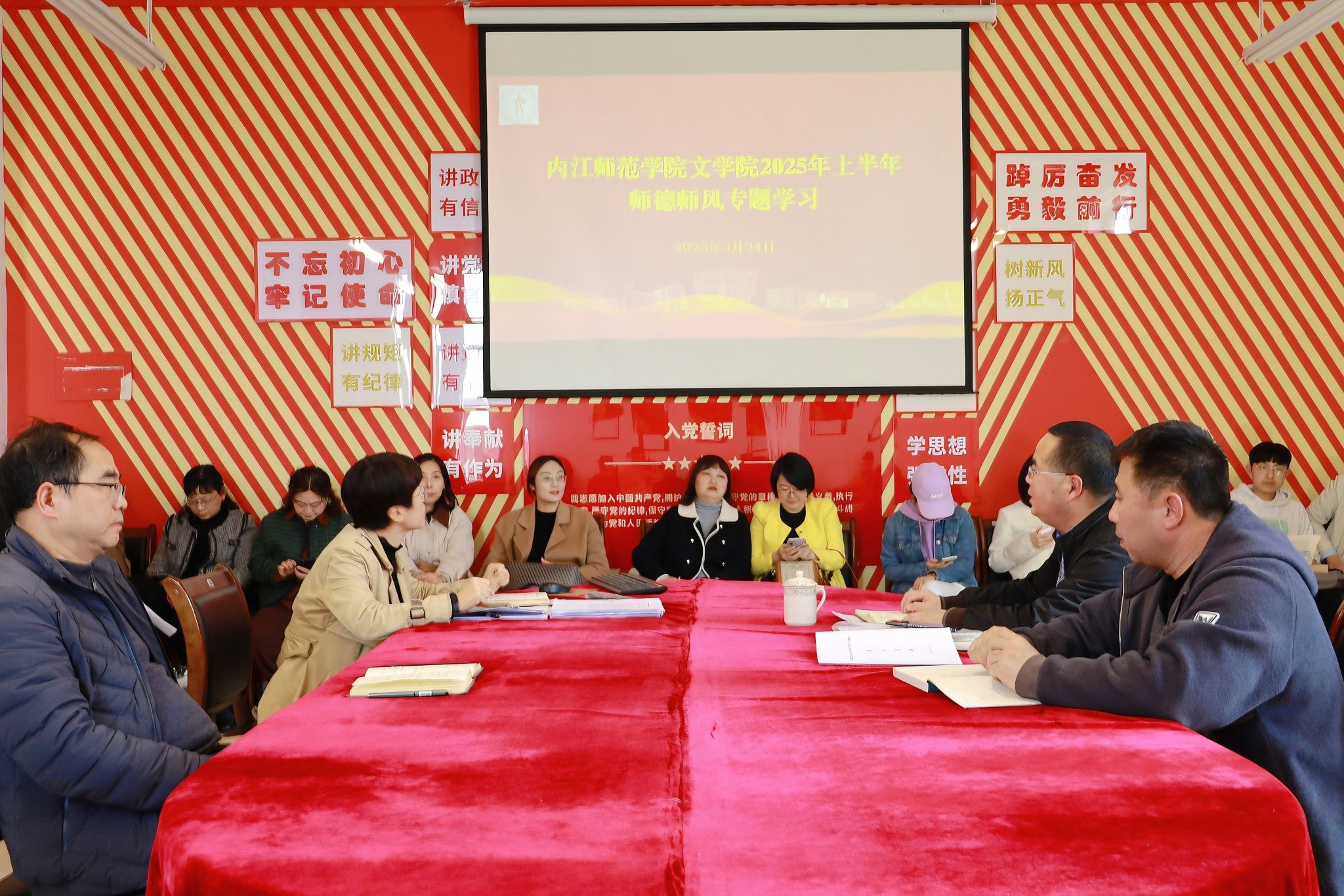 2025 年 3 月 24 日下午,tyc5997太阳集团在弘文楼506会议室召开师德师风专题学习会议,tyc5997太阳集团全体教师参加会议。本次会议旨在深入学习贯彻习近平总书记关于教育的重要论述,落实《教育强国建设规划纲要(2024-2035 年)》相关要求,进一步加强tyc5997太阳集团师德师风建设,提升教师思想政治素质和职业道德水平。