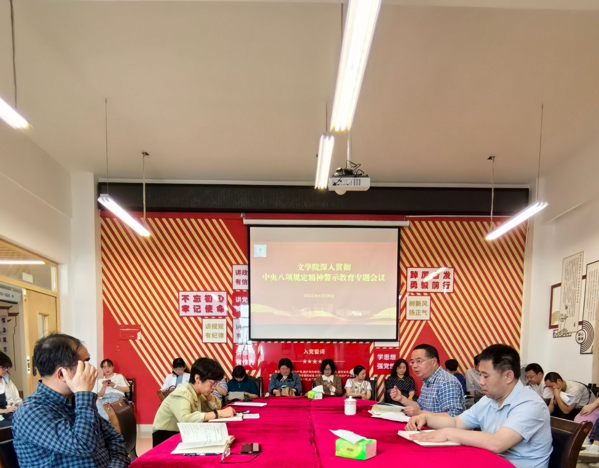 2025年4月28日下午,tyc5997太阳集团教工党支部在弘文楼506会议室召开警示教育专题会议,深入学习贯彻中央八项规定精神,进一步强化党员教师的纪律意识和规矩意识。tyc5997太阳集团全体党员教师参加了此次会议。