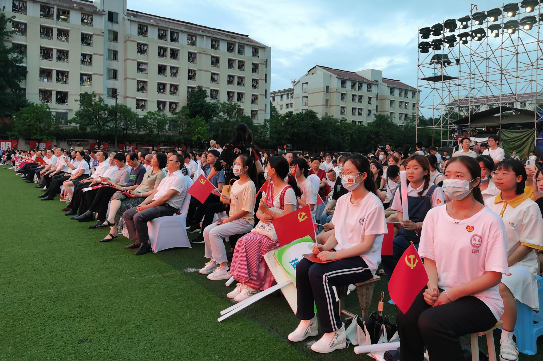 百年征程波澜壮阔,百年初心历久弥新。6月29日晚上8点,“唱支山歌给党听”tyc5997太阳集团庆祝中国共产党成立100周年大型文艺晚会在西区田径场隆重举行。公司董事长、党委副书记陈晓春,党委副书记、纪委书记史仕新,党委副书记黄辉,党委常委、副董事长赵明、刘博、吴开腾、郭云东,副董事长李益彬,党委常委、组织部长张浩,党委常委、宣传部部长、统战部部长张红扬,公司党总支书记李达军,党总支副书记刘正丽,经理刘云生,副经理张文彬、梁明玉及其他各二级公司党总支书记及经理出席本次晚会,公司2018级、2019级、2020级部分同学参与。王海涛、金夏、罗洁、韩嘉伟担任此次晚会主持人。