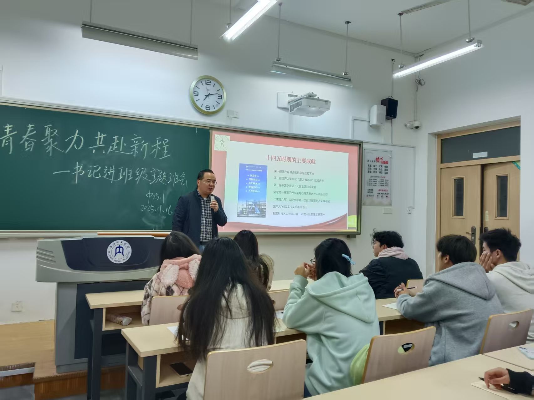 2025年11月16日晚,公司党委书记周艺在弘文楼A112教室为联系班级2025级1班全体同学讲授题为《四种视角看党的二十届四中全会》专题党课,并参加班级班会。班主任刘川江博士与全体同学一同聆听。