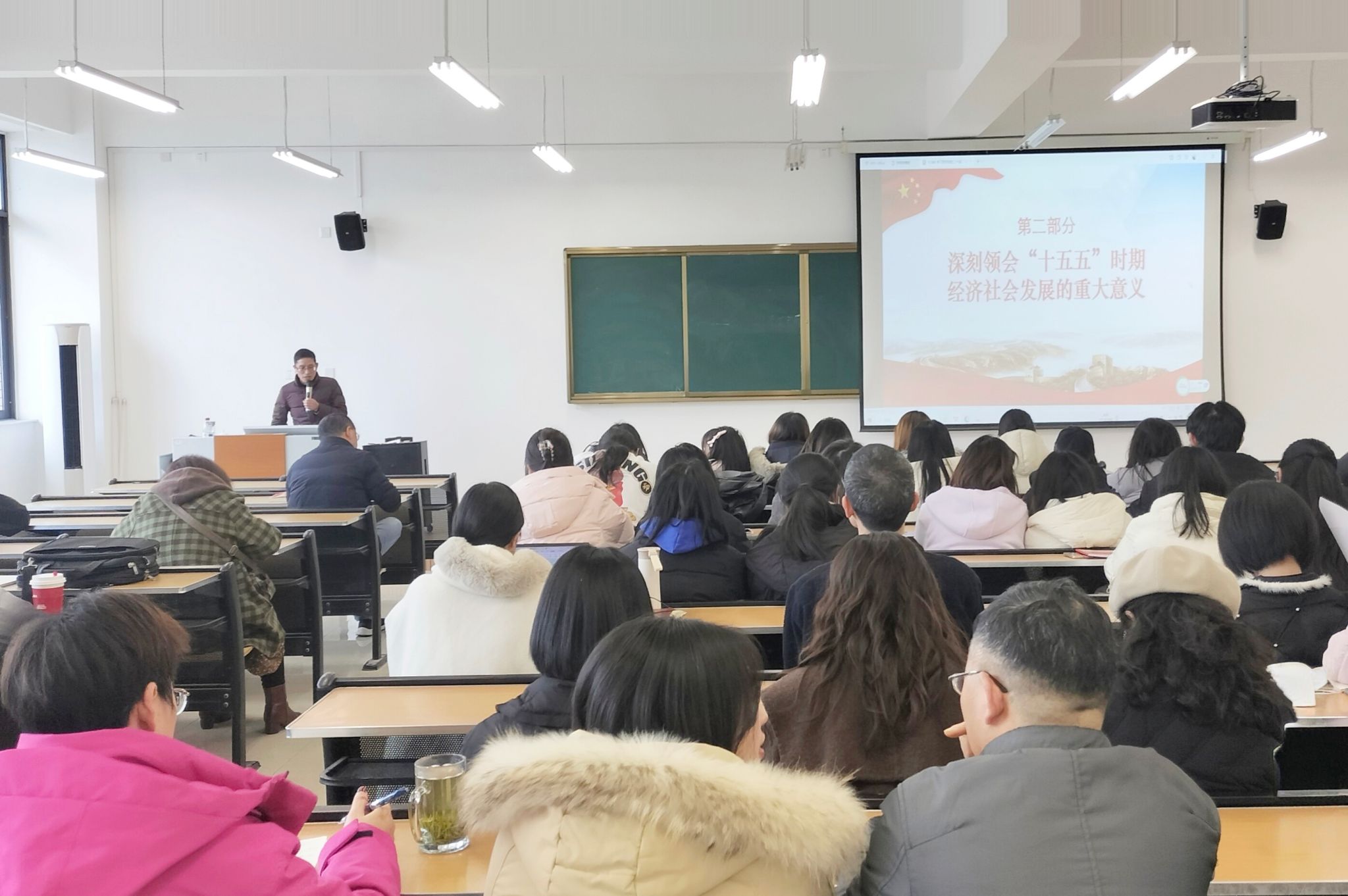 2025年12月15日下午,弘文楼502教室座无虚席。根据公司党委统一部署,公司党委举办“党的二十届四中全会精神”专场宣讲,马克思主义公司副教授、校“理响内师”青年讲师团成员张光闪应邀作题为《学习贯彻党的二十届四中全会精神——谱写“十五五”时期中国式现代化新篇章》的辅导报告。全院教职工及部分员工党员代表现场聆听。