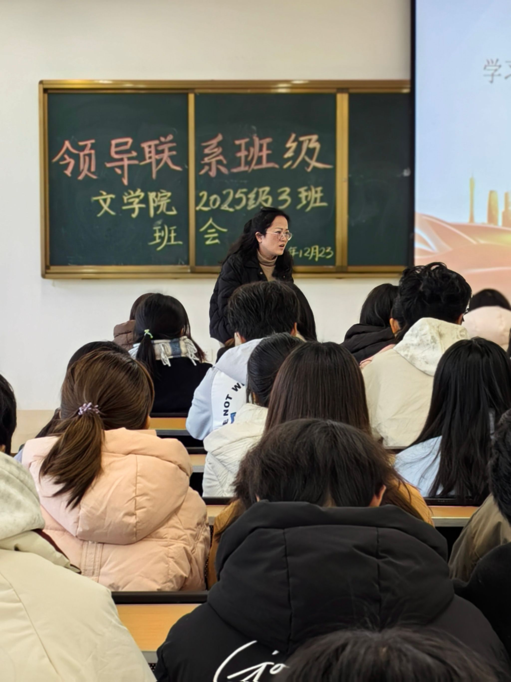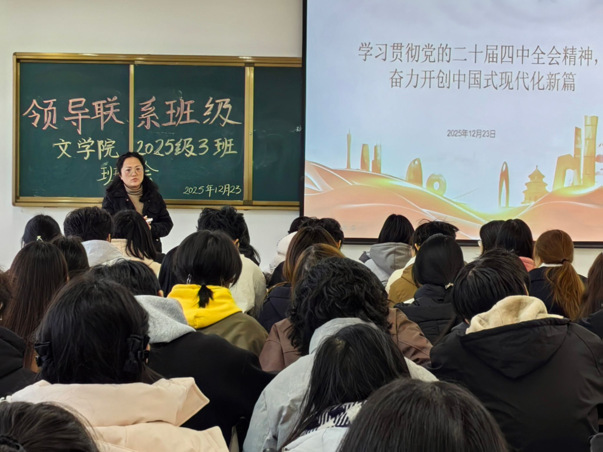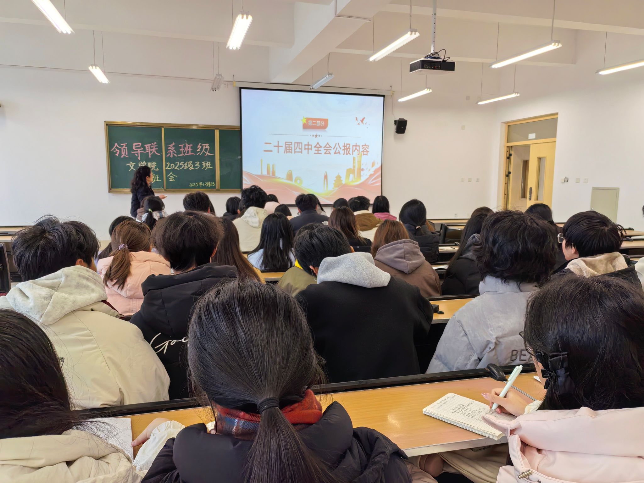 为引导新生坚定理想信念,明晰时代使命,将个人成长融入国家发展大局,12月23日下午2点30分,公司党委副书记、纪委书记周琼老师以“学习贯彻党的二十届四中全会精神 奋力开创中国式现代化新篇”为题,于弘文楼502教室为2025级3班全体新生讲授专题党课。党课紧扣党的二十届四中全会精神内核,重点解读党的二十届四中全会公报内容和“十五五”规划战略部署,为初入大公司园的新生们上好了思想引领“第一课”。