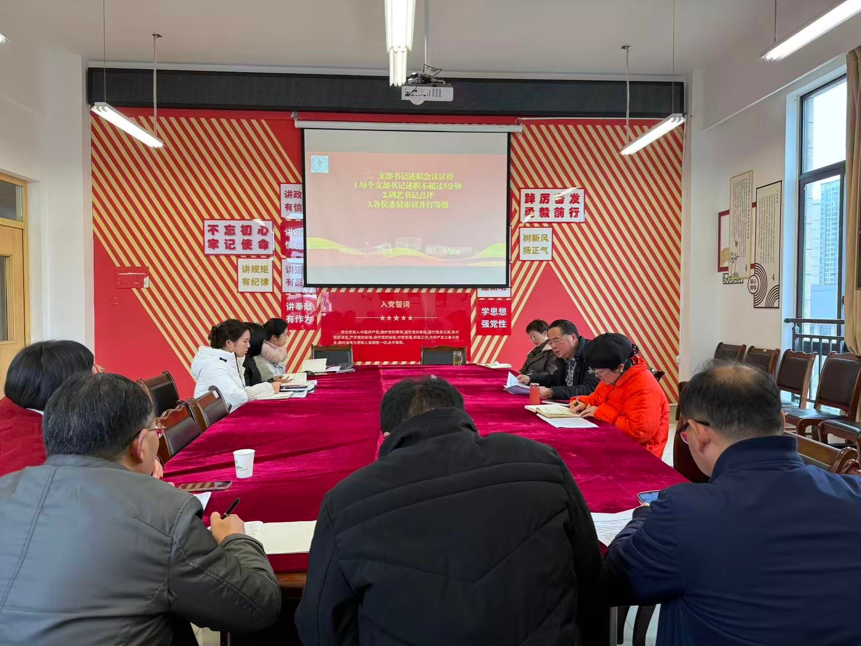 随后,会议进入述职评议环节。教工第一党支部书记张宪军、教工第二党支部书记刘川江、员工第一党支部书记金夏、员工第二党支部书记代思韫、员工第三党支部书记雷业依次登台,每人用5分钟时间亮成绩、摆问题、谈打算。大家聚焦“党建引领教学科研”“党建赋能员工双创”“党建融贯经典诵读品牌”等特色做法,数据翔实、案例鲜活。