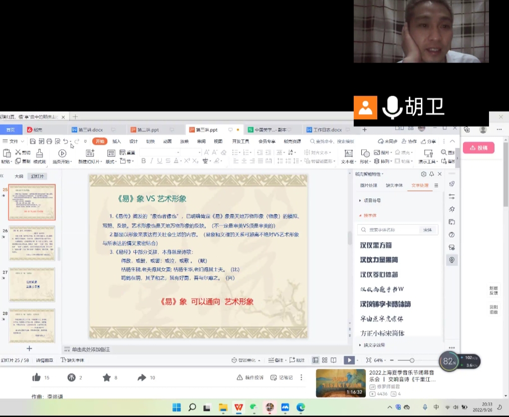 2022年9月26日晚7点,文艺学教研室教师胡卫博士的线上课程《中国美学史》在“腾讯会议”平台开讲,师生共计150余人准时进入课堂。