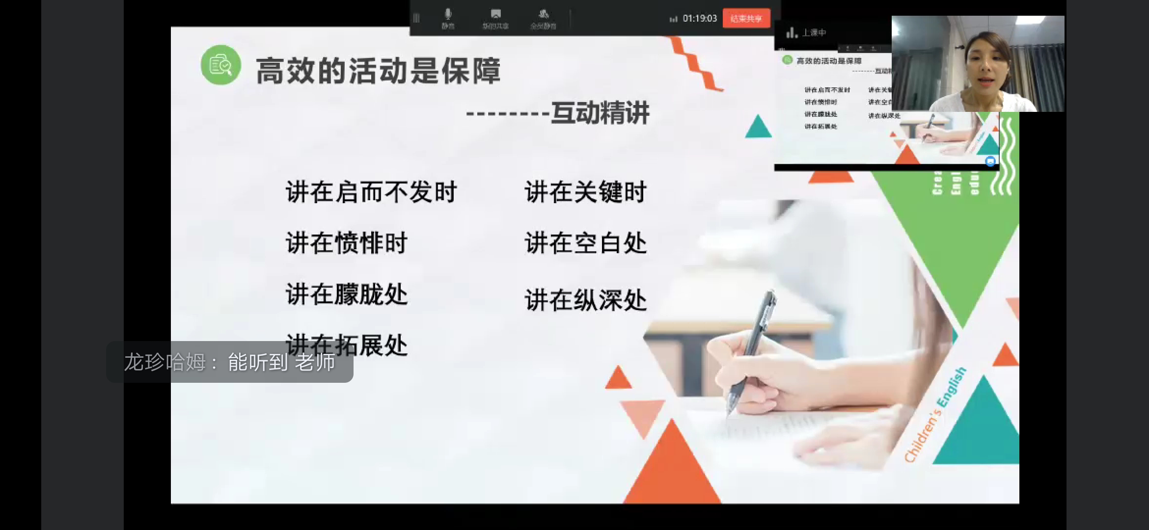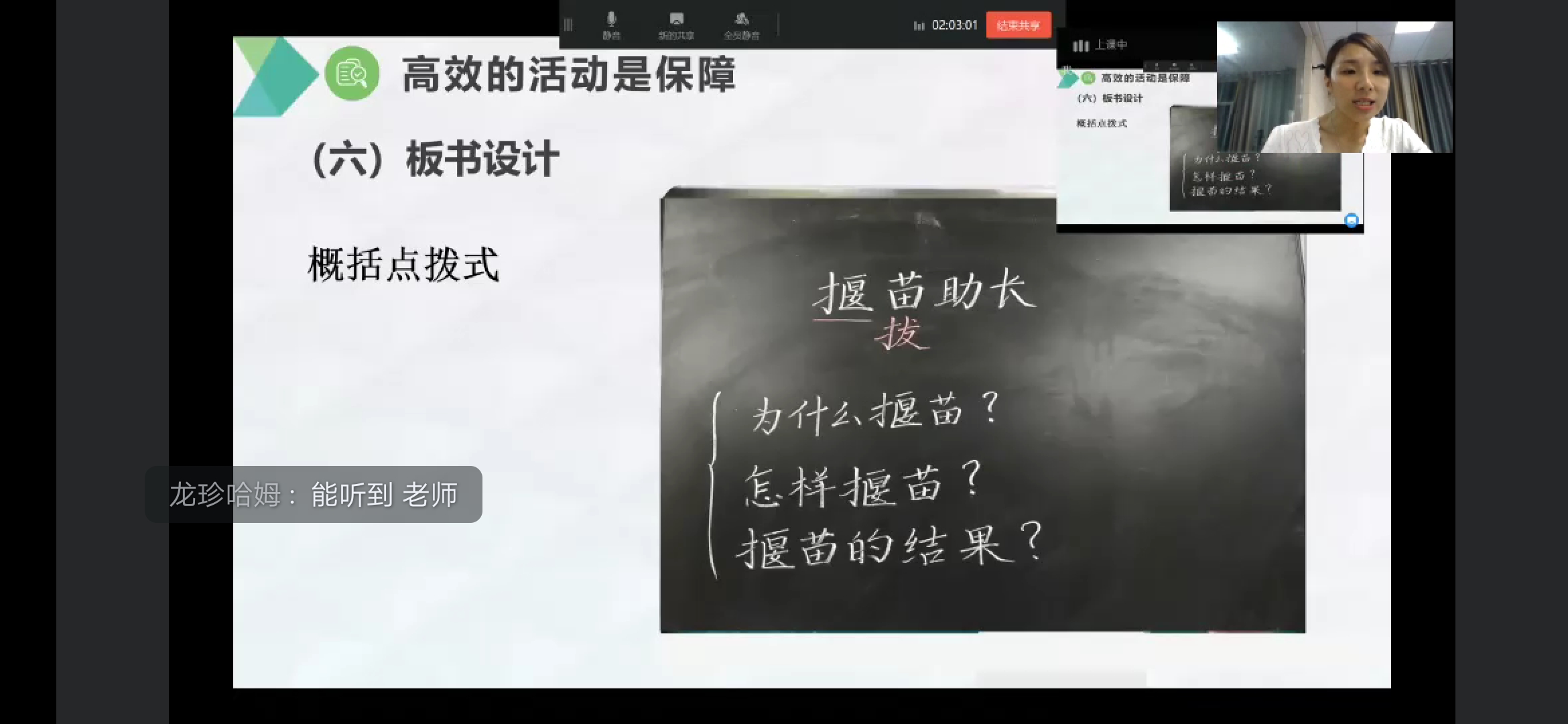 张丽蓉老师通过分析“当下课堂常见的问题”中的“六多六少”和“两化”提出建立高效课堂的迫切性。再提出高效课堂应该是由“自主建构”、“互动激发”、“高效生成”、“愉悦共享”组成的,还提出了衡量高效课堂的“四依据”和“三量”“三动”。接着分析2022年新课标提出建立高效课堂的必要性。然后张丽蓉老师从目标制定的准确性、教学重点、难点把握的准确性、学情分析的准确性、教学内容选择的合理性、问题设计的恰当性五个方面讲解“高效的备课是基础”。接着进入到了本次讲座的主体部分即“高效的活动是保障”。从“目标引入”、“自主学习”、“互动精讲”、“练习检测”、“反思总结”和“板书设计”这六个部分细致地讲解应该如何打造高效课堂,并且请了一名老师分析《升国旗》课例让听众们更好地理解“互动精讲”中的“创境、设疑”。在六个部分分析完后,张丽蓉老师又请一名老师分析《揠苗助长》课例来展现六个部分完美结合的高效课堂。最后张丽蓉老师提出“高效拓展是提升”的三个要求:“立足文本,适度拓展”、“紧扣文本,有效拓展”、“挖掘文本,深度拓展”。最后张丽蓉老师表达了自己对所有老师的祝愿和期望。