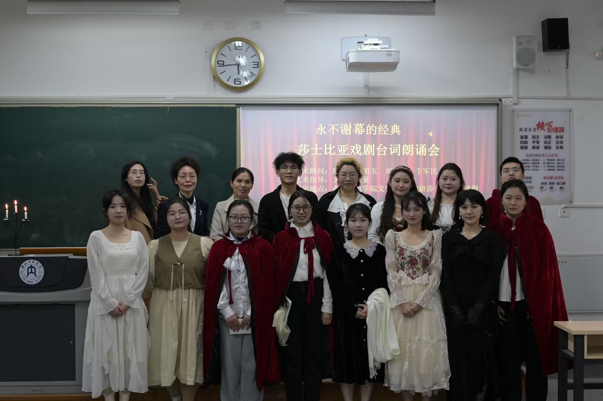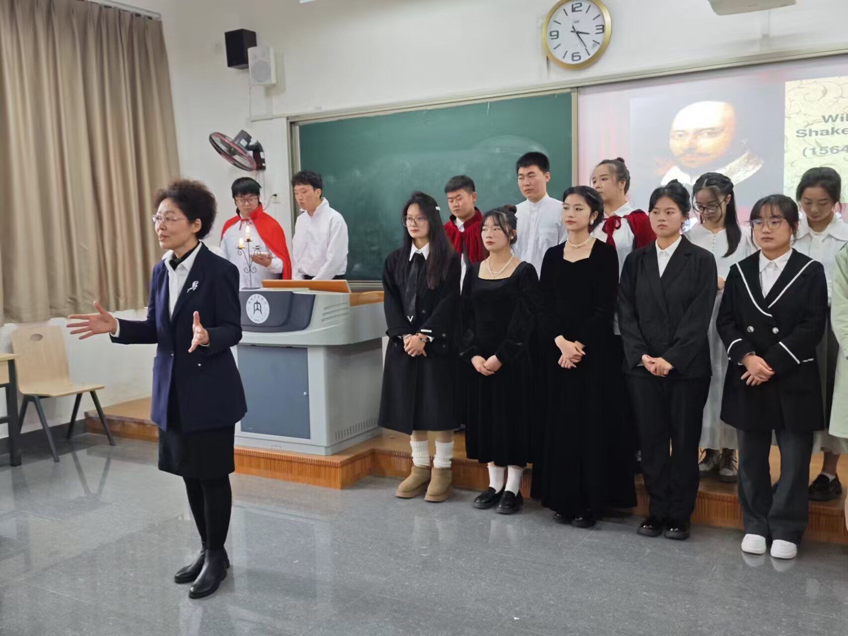 12月5日下午3点,由公司2021级2班同学组成的“tyc5997太阳集团莎士比亚环球剧团”在明德楼B116莎士比亚环球剧场成功举办“永不谢幕的经典——莎士比亚戏剧节台词朗诵会”。公司党委书记周艺,副经理(主持工作)梁明玉,党委副书记刘正丽,副经理于军民、王昕担任艺术顾问。tyc5997太阳集团教授王彤、辅导员金夏担任艺术指导。王韵涵、兰心毓、李玉婷、刘俞孜、徐星雪五位同学担任导演。2021级2班部分同学参与演出。tyc5997太阳集团部分教师、员工观看了此次演出。