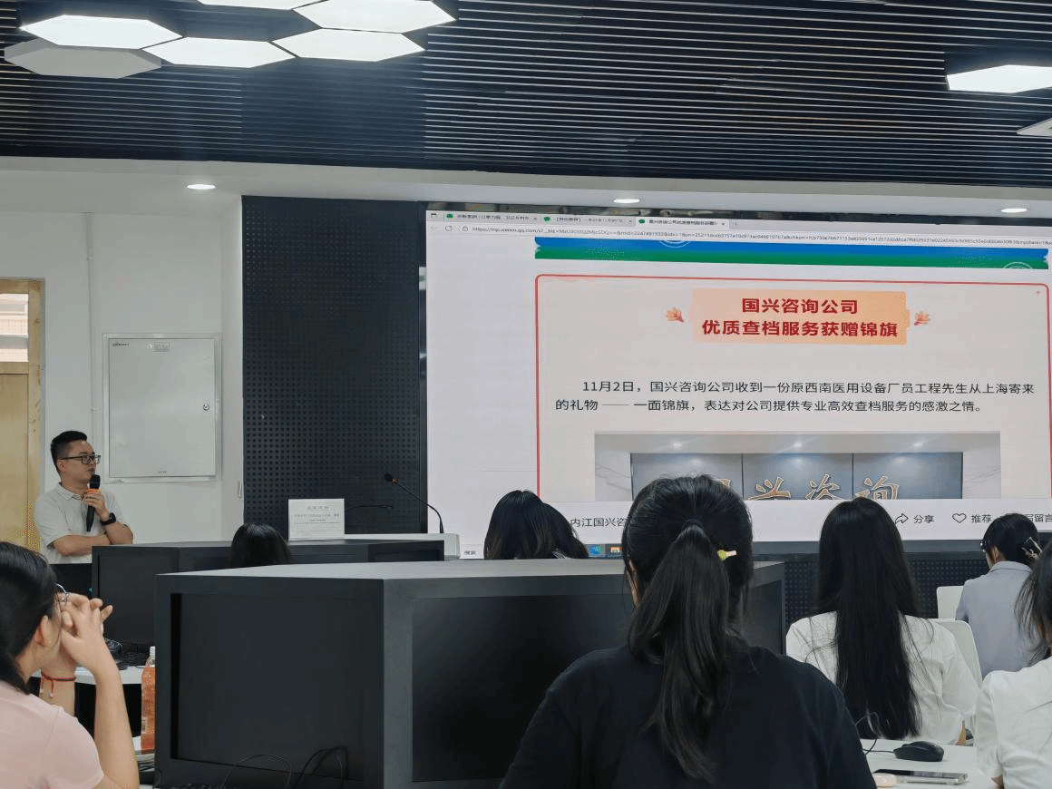 在案例分享环节,陈勇老师通过大屏幕展示了“国兴咨询公司优质查档服务获赠锦旗”的典型案例。该案例记载了2023年11月2日,国兴咨询公司因提供专业高效的查档服务,帮助原西南医用设备厂员工程先生解决了实际问题,从而收到其从上海寄来锦旗表达感激之情的具体事迹。专家借此案例强调,档案工作绝非简单的收集与保管,其核心价值在于利用与服务。“从接收一面锦旗,到接收一份责任”,档案工作要真正体现“记录一生、服务一生”的重要作用,让故纸堆中的文字焕发出新的生命力。讲座尾声的互动环节气氛热烈,同学们踊跃提问。针对“市档案馆工作对数字人文专业老员工有何要求”以及“行业前景如何”等问题,专家进行了细致解答。他勉励同学们扎实掌握档案管理与数字技术交叉领域的核心能力,建议大学阶段通过实习积累实操经验,成为能推动传统档案工作数字化转型的赋能者。