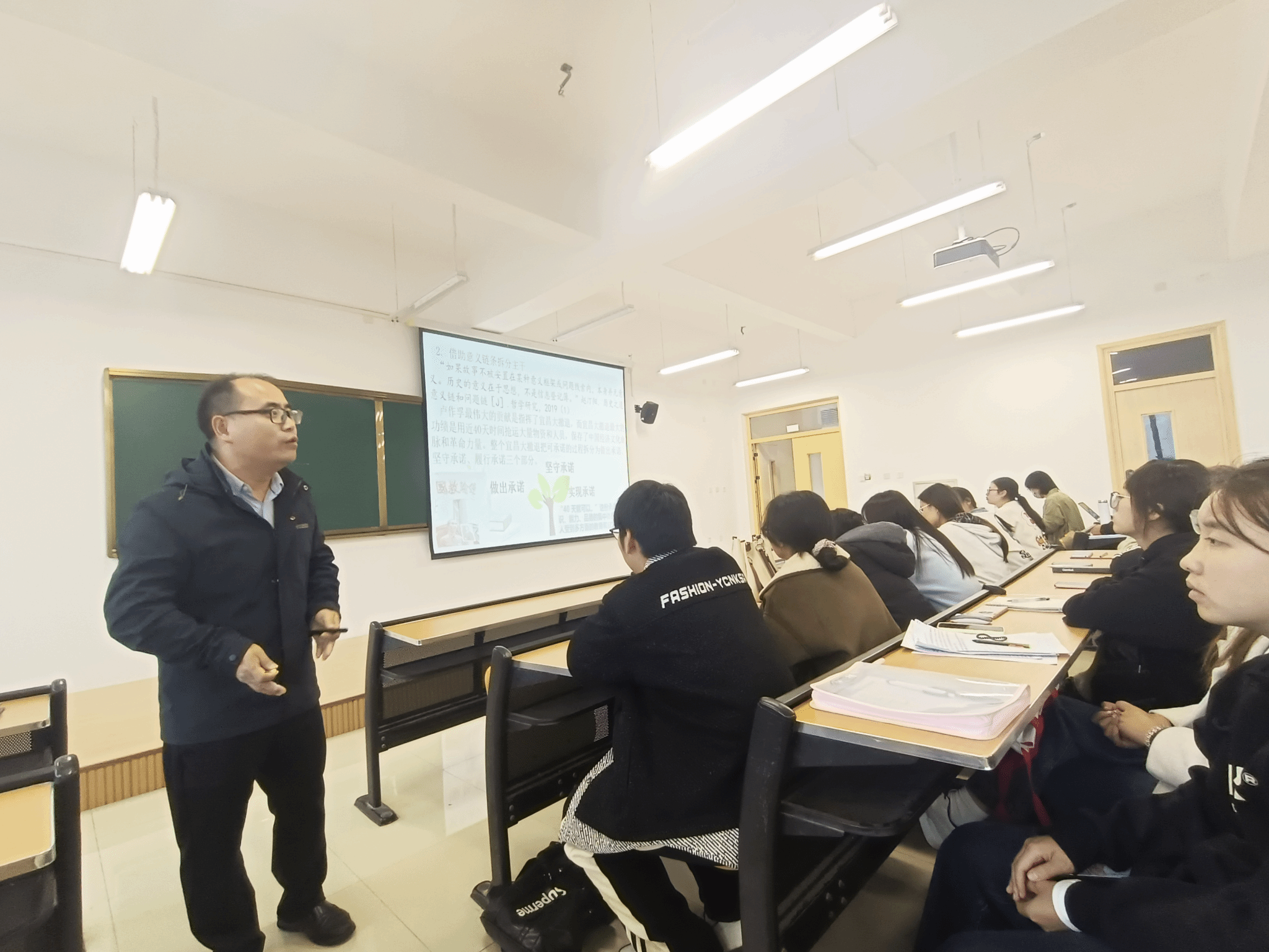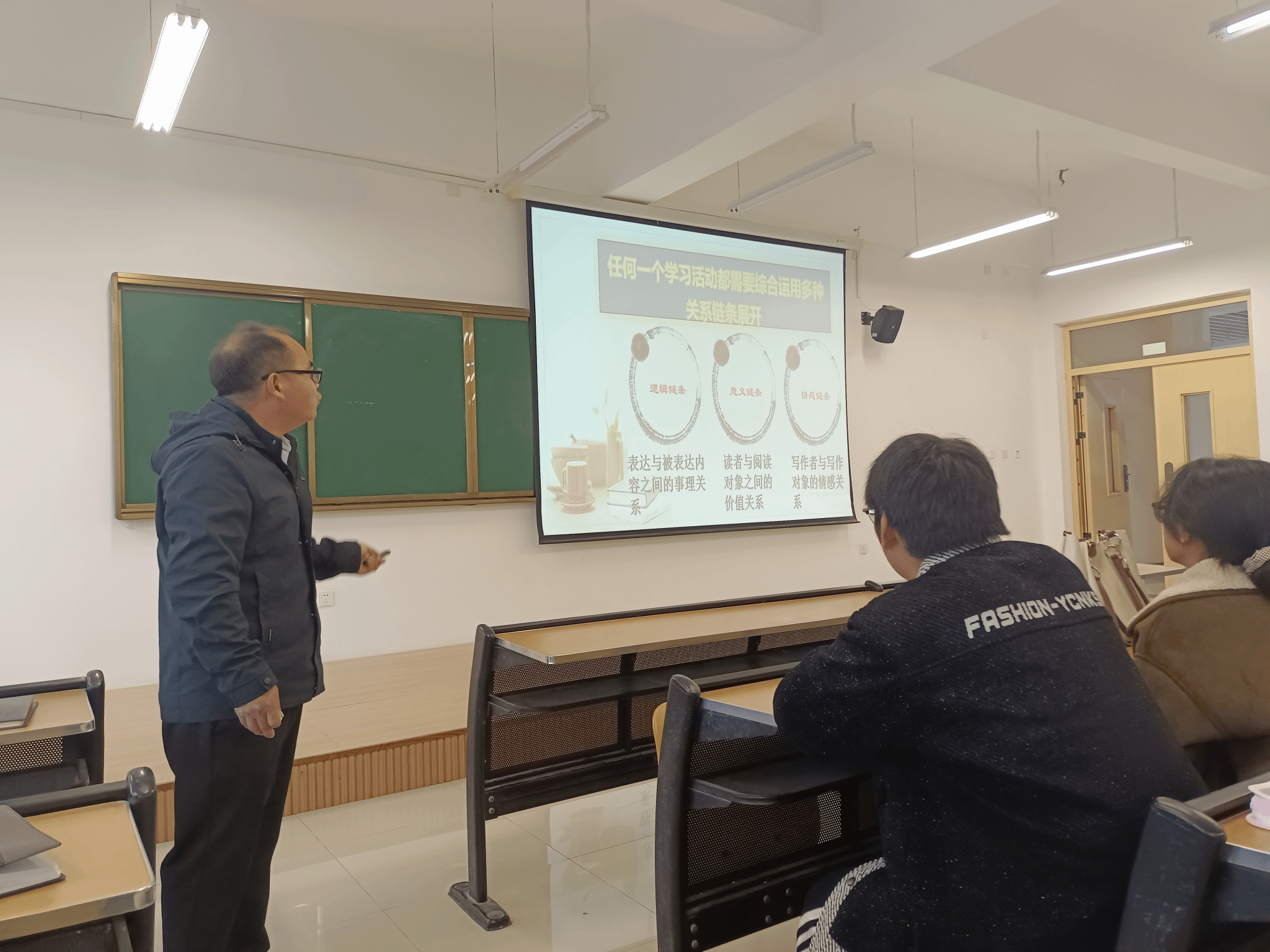 刘川江老师首先对该课程的研究价值、研究过程、研究成果等方面做了系统的思政创新汇报,然后进行了主题为“基于问题链进行‘家乡人物志’写作学习活动”的课堂教学活动展示,课堂中刘老师的教学环节主要围绕着“如何借助问题链认识家乡人物志”“如何借助问题链写作家乡人物志”“如何借助问题链指导员工写作家乡人物志”三大主问题展开。在认识家乡人物志的教学过程中,刘老师从“问题链”“人物志”的概念入手,分析了家乡人物志的真实性、文学性、文化性等特点,并以杨振宁先生的《邓稼先》一文为例详细分析了家乡人物志的主要内容。在写作活动中,刘老师借助问题链对写作中的“删除枝蔓”“区分主干”“添枝加叶”等具体写作流程进行了展示,给员工带来丰富的启示。刘川江老师将课堂教学与实际应用相结合,循序渐进,调动了同学们的积极性,带领同学们走进写作教学的理论深处,打造了一个高效愉悦的课堂,充分展示了深厚的文学理论素养和精湛教学水平。